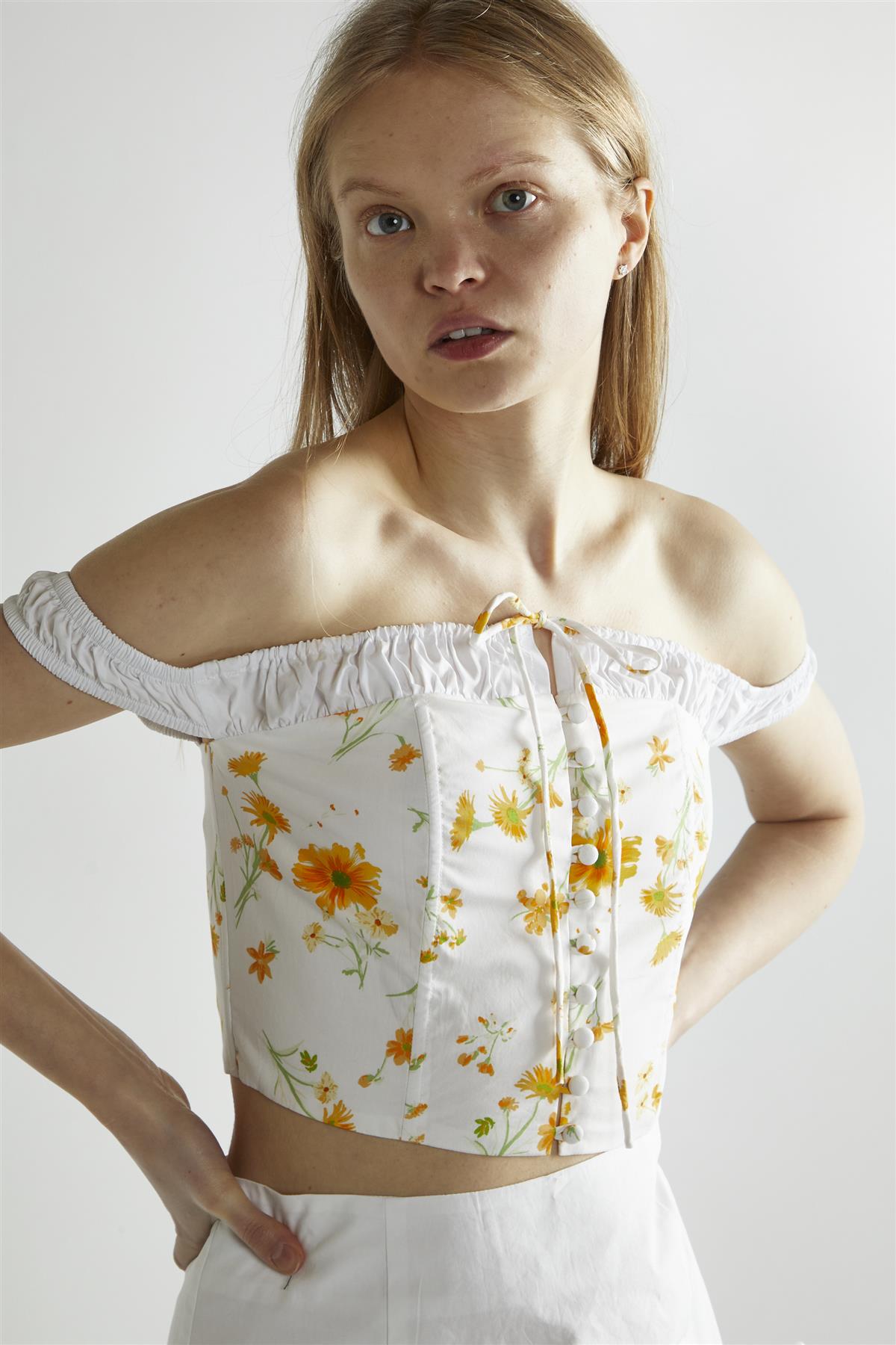 Marigold Floral White Corselette Crop-Top