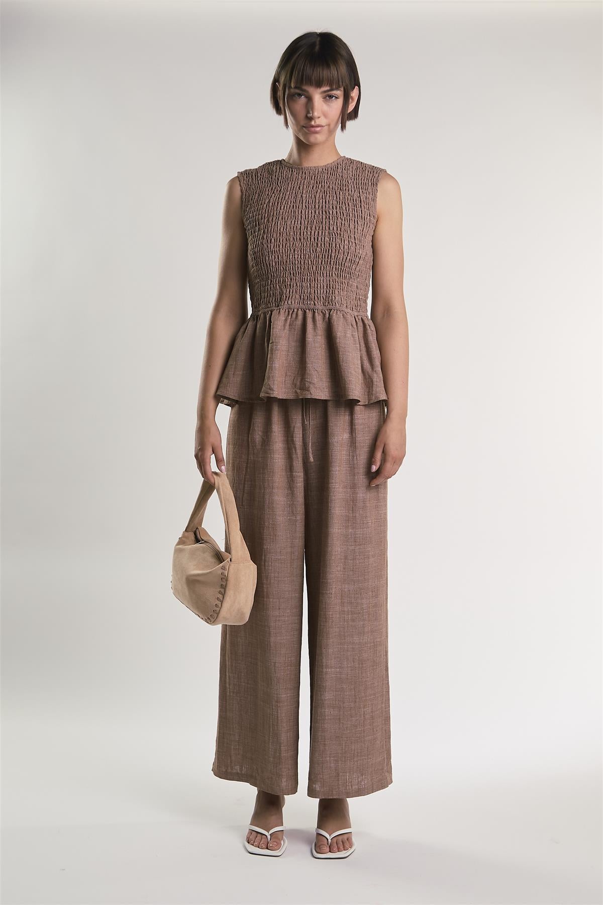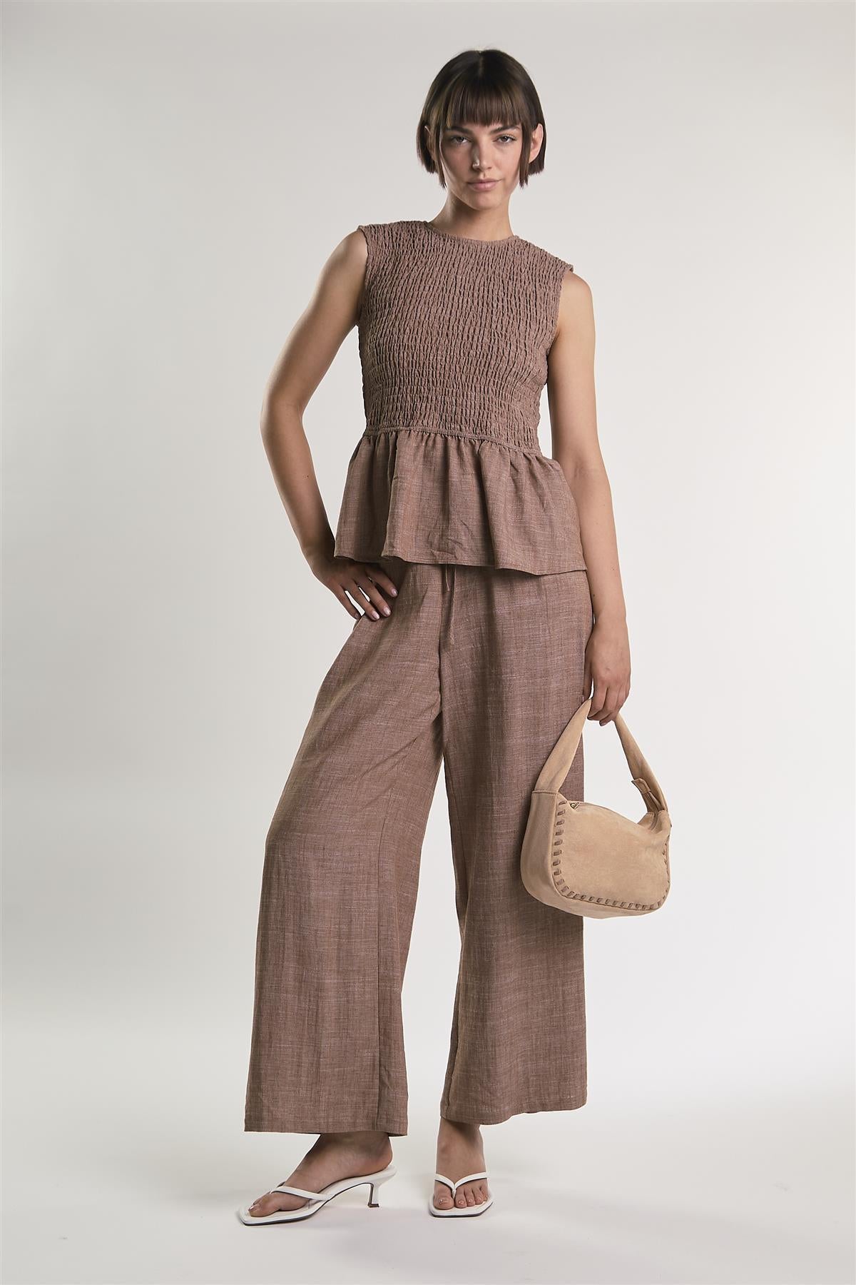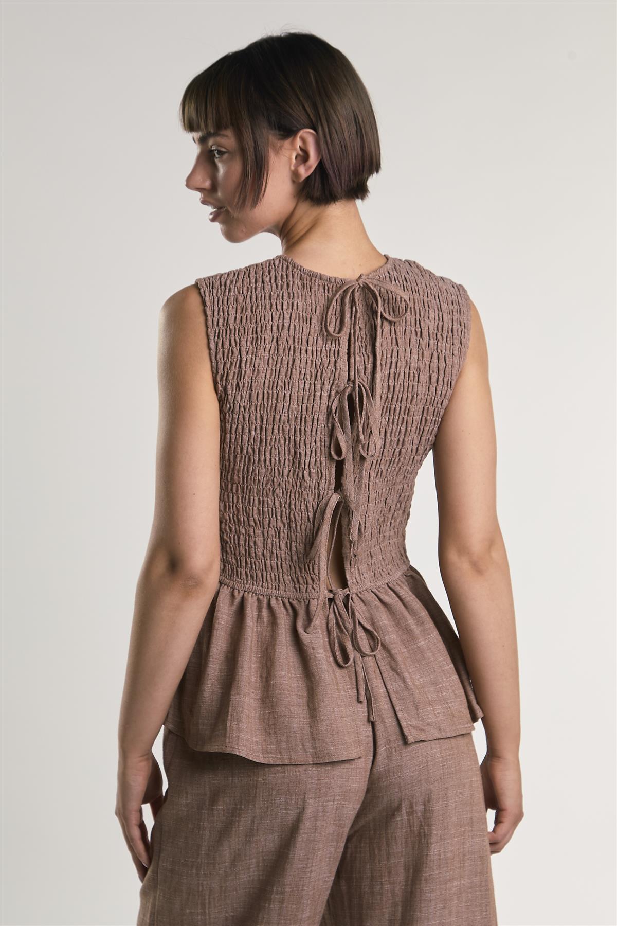 Glamorous Women's Mid Brown Fleck Smocked Peplum Top. Effortless elegance meets relaxed charm in this beige fleck maxi dress, designed to make every step feel graceful and confident. The square neckline frames the shoulders beautifully, while the tie at the front adds a subtle, stylish detail that draws the eye and enhances the silhouette. Sleeveless design keeps the look light and easy to layer, and soft pleats at the front and back bodice create gentle movement for a flattering, flowing fit. Perfect for pairing with simple sandals or minimal accessories, this dress offers a versatile, polished look that balances comfort with timeless style.