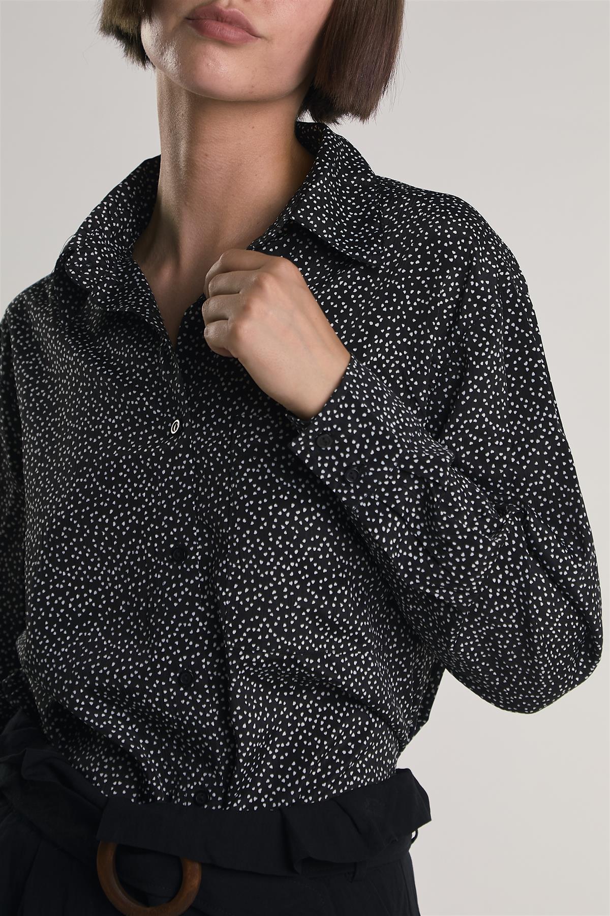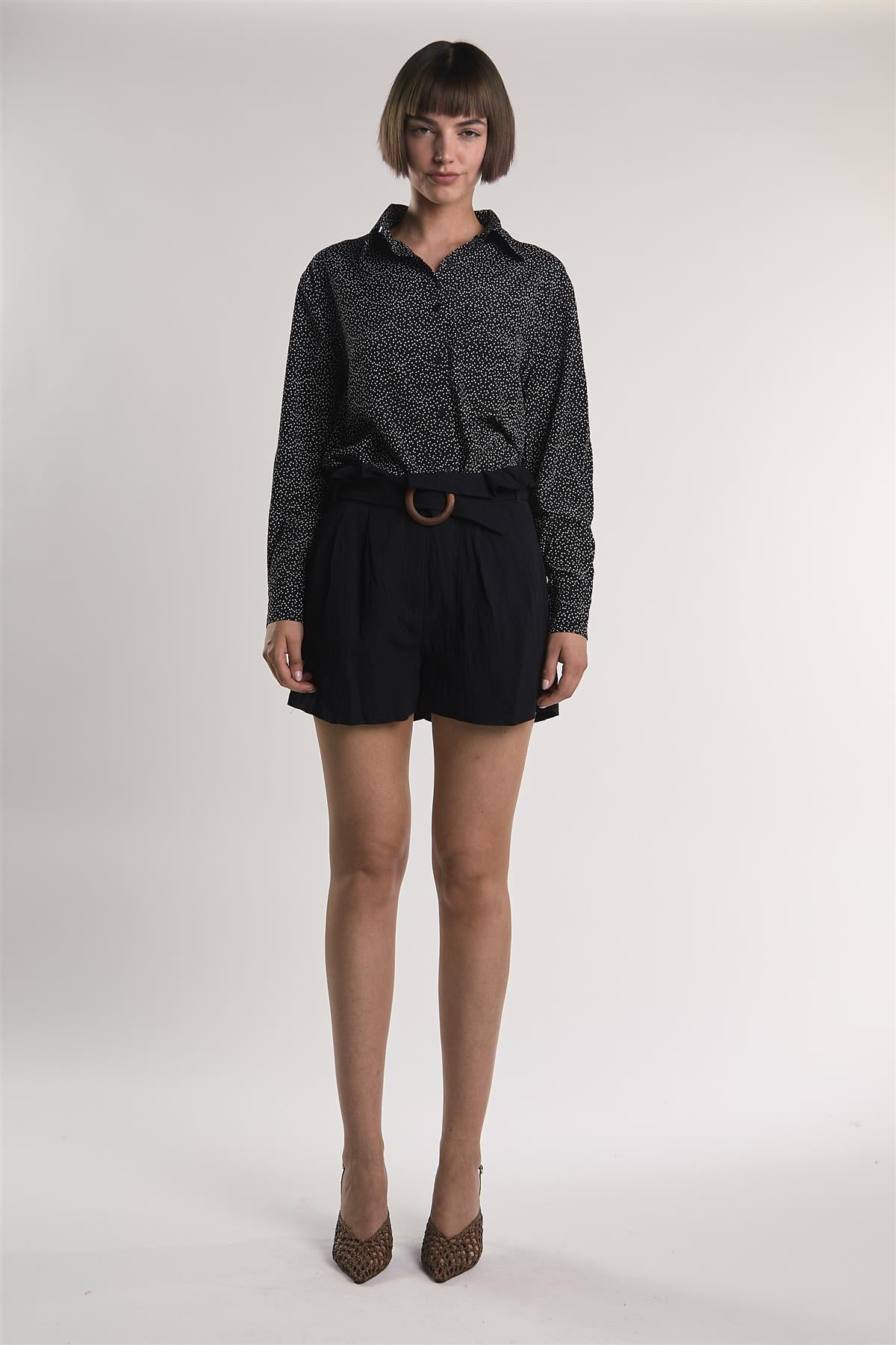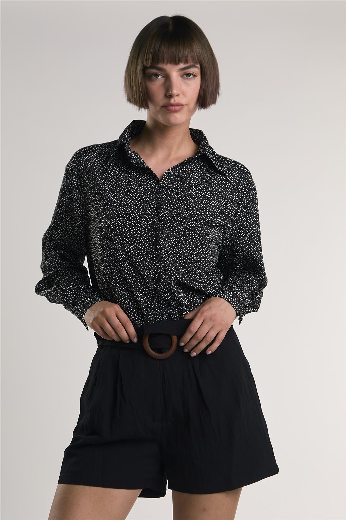 Elevate your signature style with a cute edge on a classic. The Minature Heart Print Button Front Long Sleeve Top is the perfect addition for your day to evening wardrobe, adding a soft and sweet element to your look. Style it with high waisted shorts and to go-to flats to complete the look.