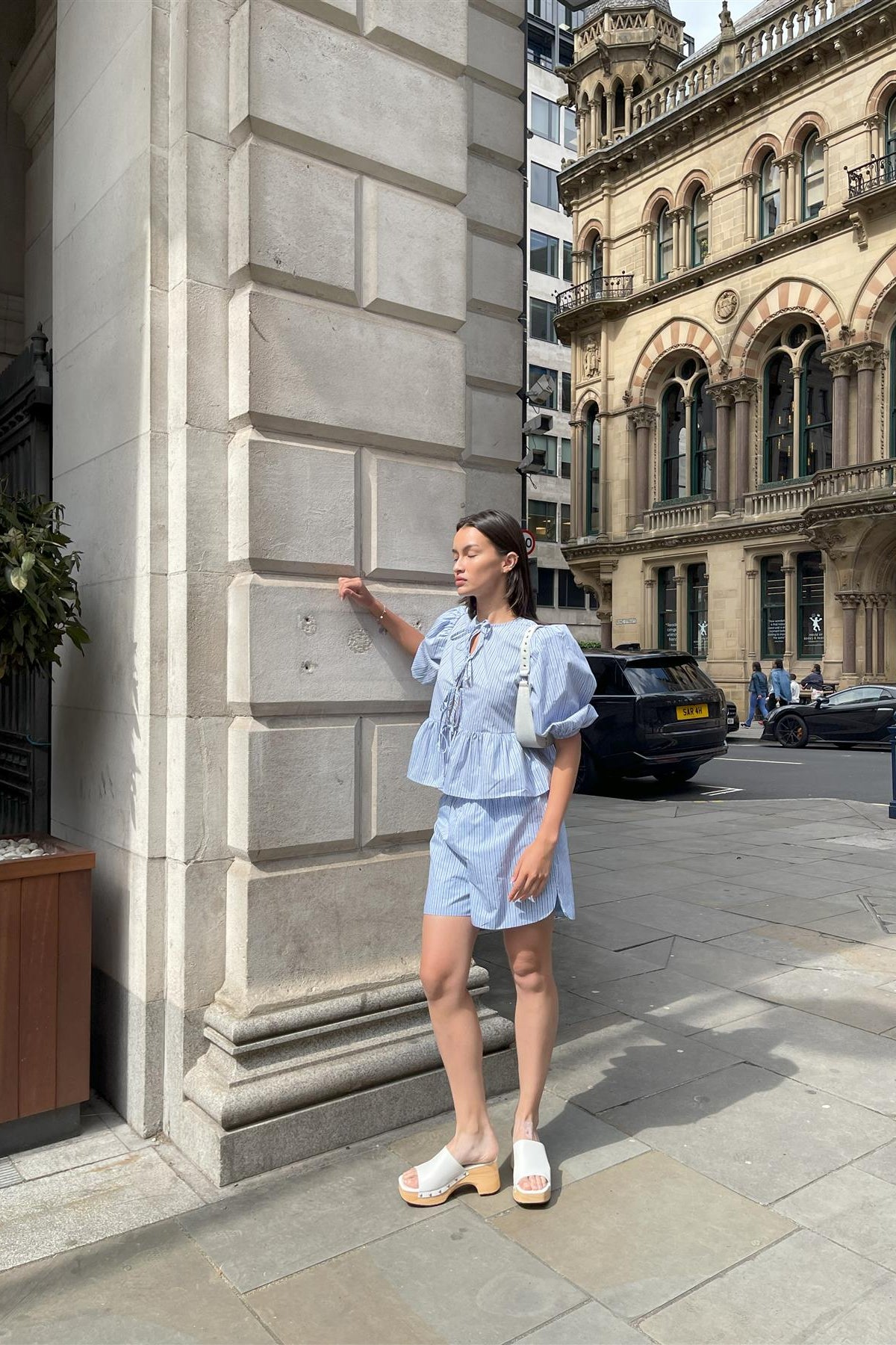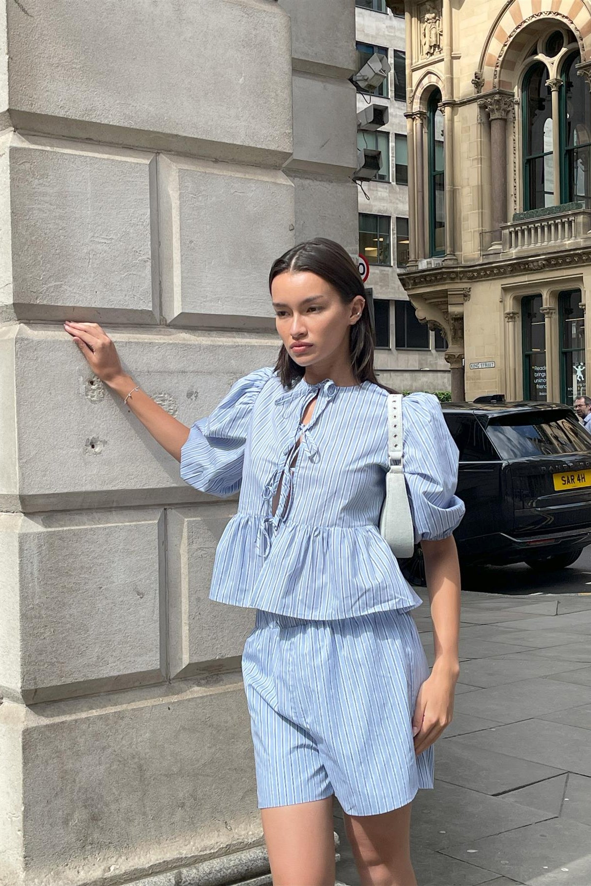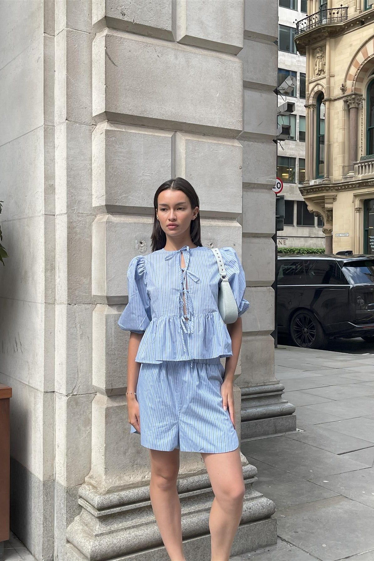 Glamorous Women's Mixed Blue Stripe Tie-Front Shorts. These mixed blue stripe tie-front shorts are like a cool breeze on a hot summer day. They're the kind of shorts that make you want to grab an ice cream cone and head to the nearest park. The playful stripes give off a carefree, beachy vibe that'll have you feeling like you're on vacation, even if you're just running errands. The tie-front detail adds a cute twist, giving you that extra bit of style without any extra effort. And let's talk about comfort - the elasticated waistband is like a gentle hug for your waist, making these shorts perfect for all-day wear. The best part? They come with a matching top, so you've got a ready-made outfit that's as easy as it is adorable. Throw this set on for a farmers market run, a backyard BBQ, or just lounging around the house feeling breezy and beautiful. These shorts are your ticket to effortless summer style, no beach required (but highly recommended).