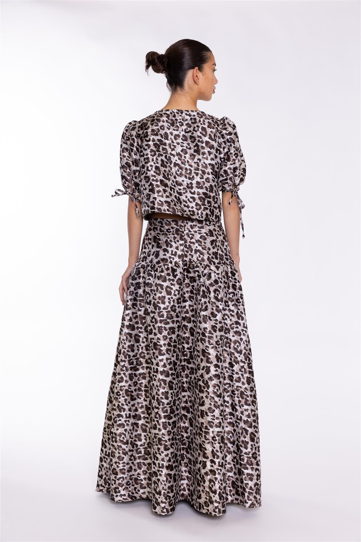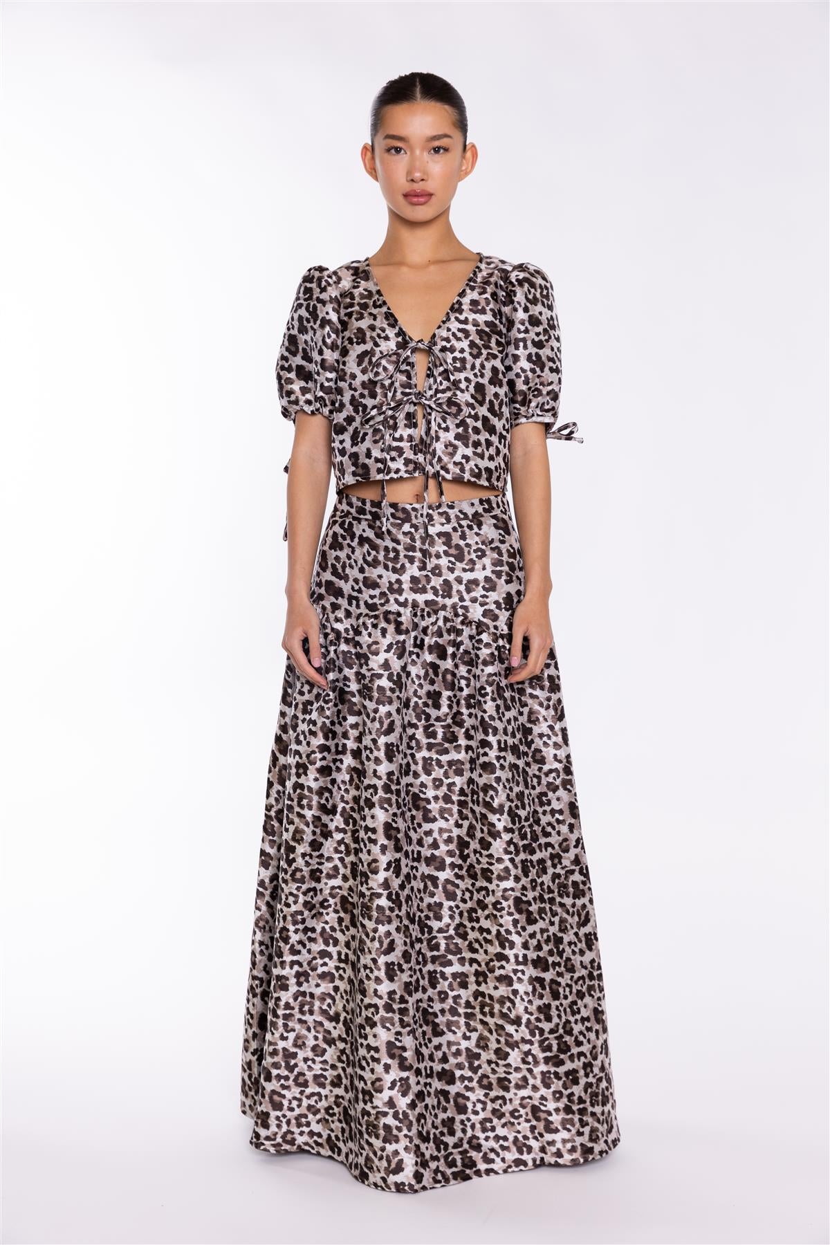 Glamorous Women's Mocha-Leopard Tie-Front Crop-Top. Add a touch of wild charm to your wardrobe with this mocha leopard tie-front crop top. The tie-front detailing creates a flattering, figure-hugging silhouette that's sure to turn heads. The puff sleeves add a playful touch, while the cropped length is perfect for pairing with your favourite high-waisted bottoms. This top is ideal for a casual day out with friends or a night out on the town. Pair it with some distressed denim jeans and sneakers for a relaxed look, or dress it up with a flowy skirt and heels for a more glamorous vibe. The mocha leopard print is both bold and playful, making this top a true showstopper. This crop top is sure to make you feel confident and fabulous from the moment you put it on..