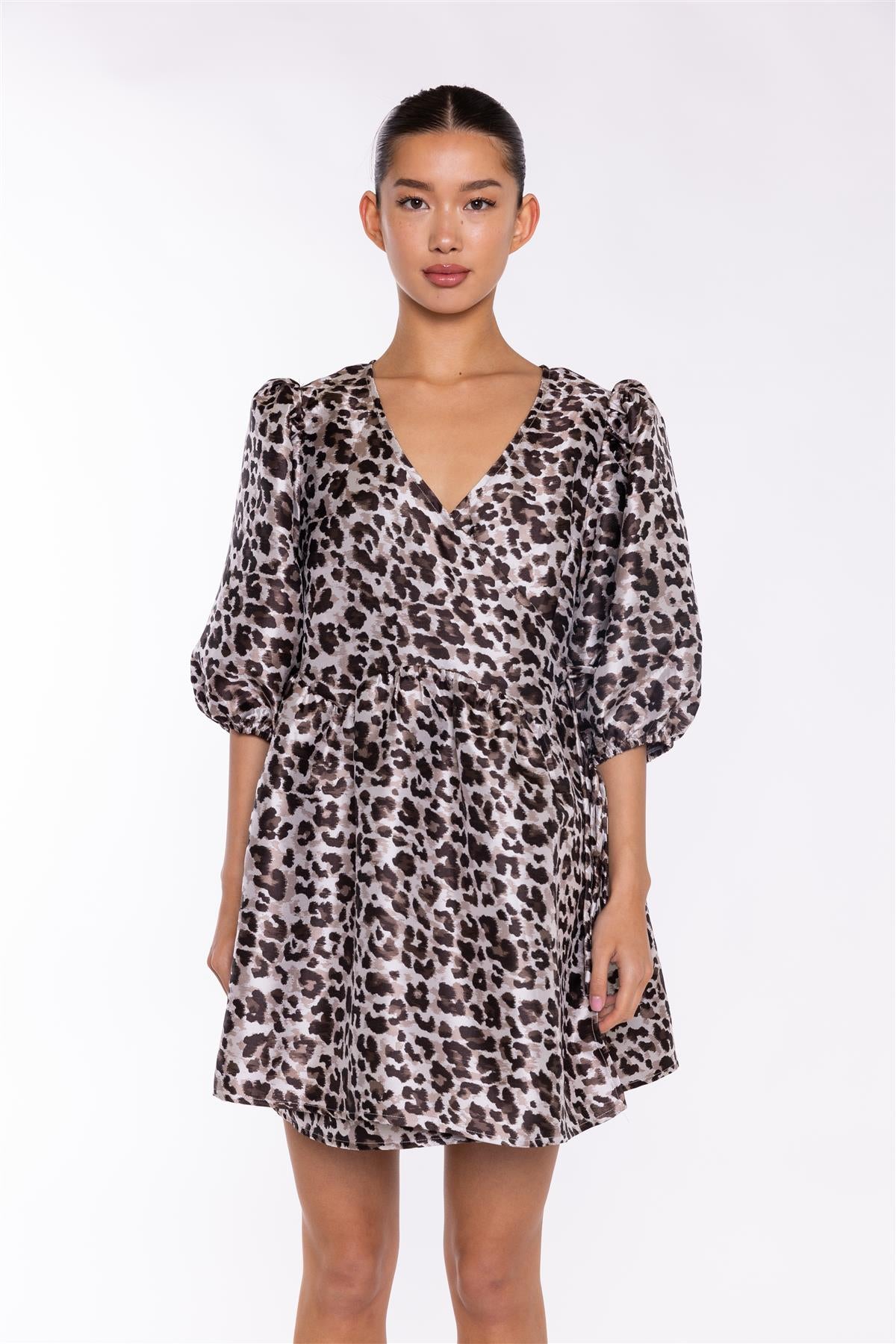 Glamorous Women's Mocha-Leopard Wrap Babydoll Mini-Dress. Step out in style with this mocha leopard wrap babydoll mini dress. The wrap design creates a flattering, figure-hugging silhouette that cinches at the waist and flows out into a flirty mini skirt. The babydoll silhouette and curved waistline add a playful touch, while the oversized fit keeps you comfortable all day long. The puff sleeves add a touch of drama, while the mini length is perfect for showing off your legs. This dress is ideal for a casual day out with friends or a night out on the town. Add a touch of winter wonder to your look by pairing the dress with a pair of tights and knee-high boots. Top it off with a faux fur coat for a cozy, winter-inspired look.