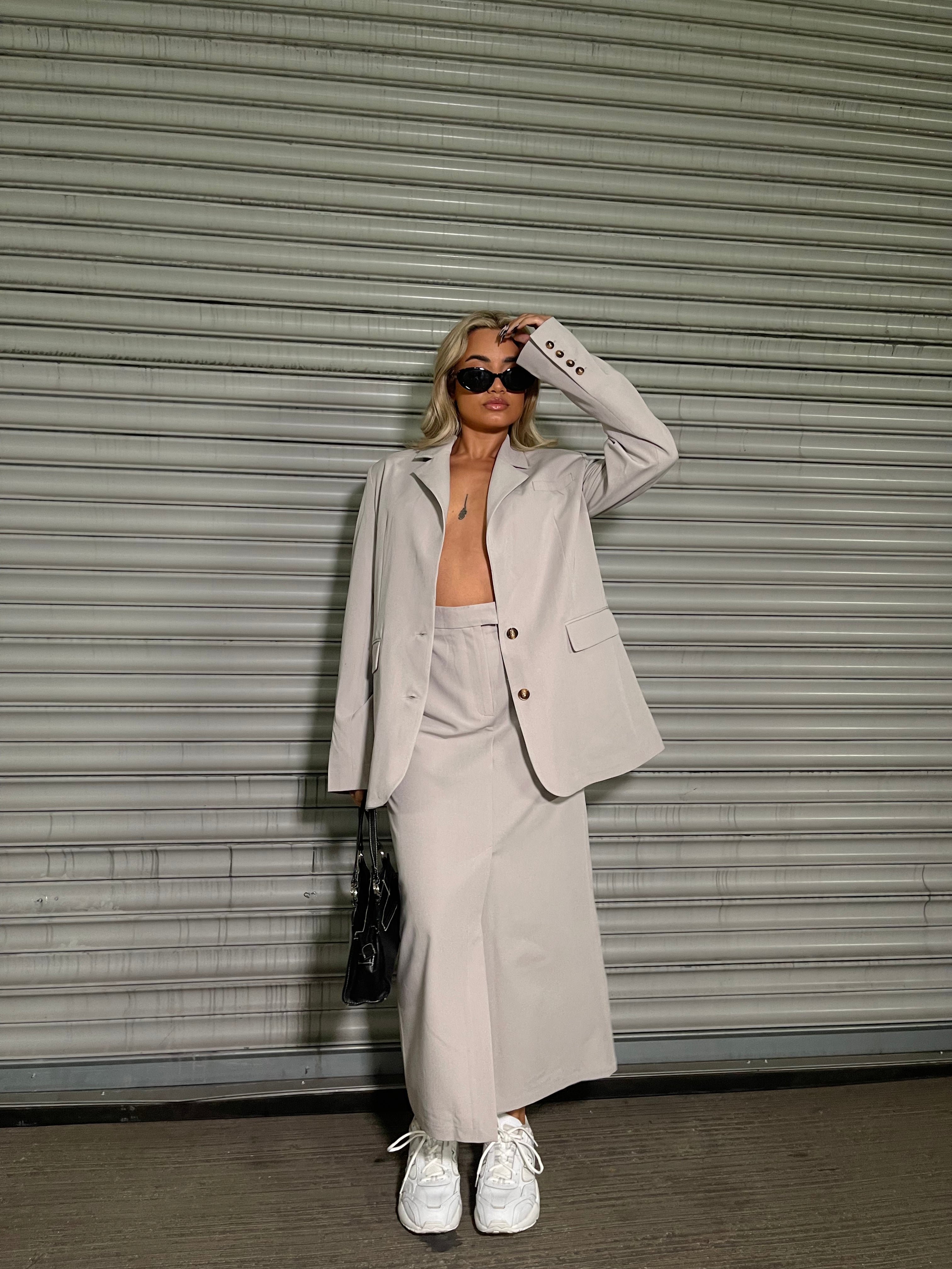 Glamorous Studio Womens Mole Grey Pencil Skirt Midaxi-Skirt. Be playful and chic with this midaxi grey skirt featuring a stylish front split. Complete the look with the matching jacket for a coordinated outfit. A must-have for any fashion-forward individual.