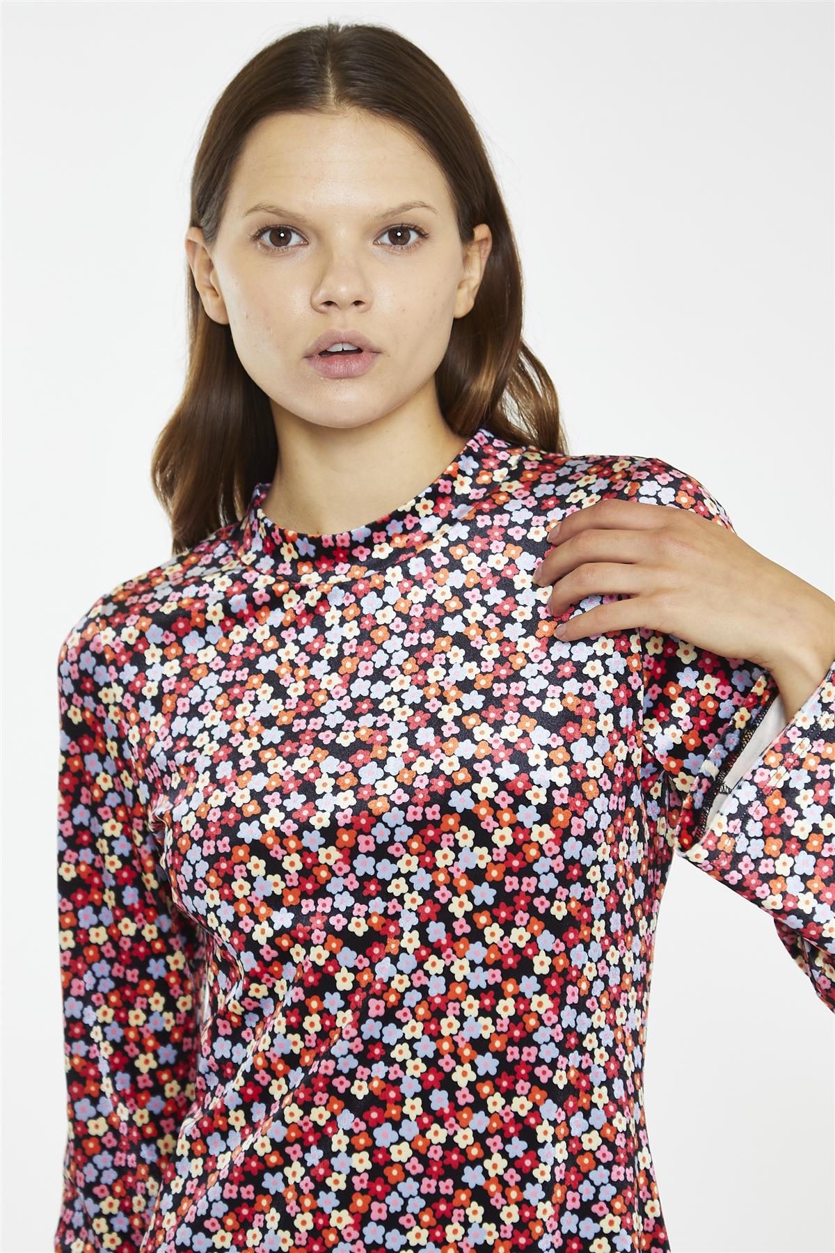 Glamorous Women's Multi-Ditsy-Velvet Long-Sleeve-Peplum Mini-Dress. This charming mini-dress combines playful style with luxurious texture, making it a standout piece for any occasion. The soft velvet fabric adds a touch of elegance, while the ditsy floral print brings a whimsical, vintage-inspired vibe. Long sleeves provide warmth and coverage, making it suitable for various seasons. The peplum silhouette creates a flattering shape, accentuating your waist and adding a feminine flair to the overall design. A round neckline keeps the look classic and versatile. Pair this dress with ankle boots and tights for a cozy autumn ensemble, or wear it with strappy heels for a night out. Layer it with a leather jacket for an edgy contrast, or add a delicate cardigan for a softer look. Accessorize with statement earrings to complement the intricate print, or keep it simple with a dainty necklace. This mini-dress is a delightful addition to your wardrobe, offering both comfort and style in one eye-catching package.