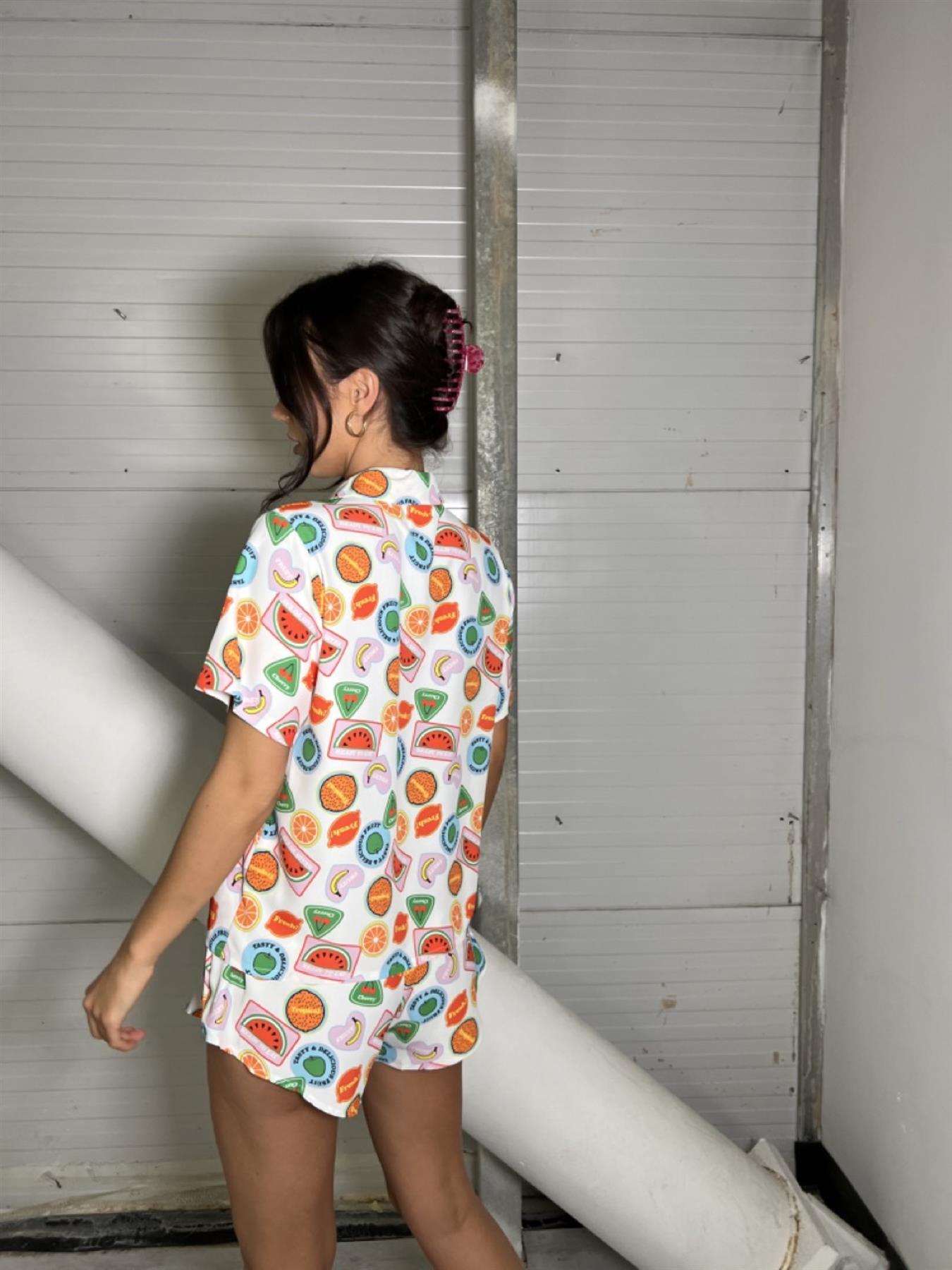Glamorous Women's Multi Fruit Stickers Button Front Short-Sleeve-Shirt. This playful button-front shirt is a burst of fun for your wardrobe, featuring a delightful array of fruit stickers that'll bring a smile to your face every time you wear it. The short sleeves make it perfect for those sunny days when you want to feel cool and look cool too. With its relaxed fit, this shirt is all about comfort without sacrificing style. The button-front design allows you to adjust your look - keep it fully buttoned for a polished appearance or leave a few undone for a more laid-back vibe. Pair it with the matching shorts for a coordinated outfit that screams summer fun, or mix it up with your favourite jeans for a casual day out. This versatile piece is ideal for picnics in the park, beach outings, or simply lounging around on weekends. The fruit sticker print adds a quirky touch that's sure to be a conversation starter. Made from soft, breathable fabric, this shirt ensures you stay comfortable all day long, no matter what adventures you have planned.