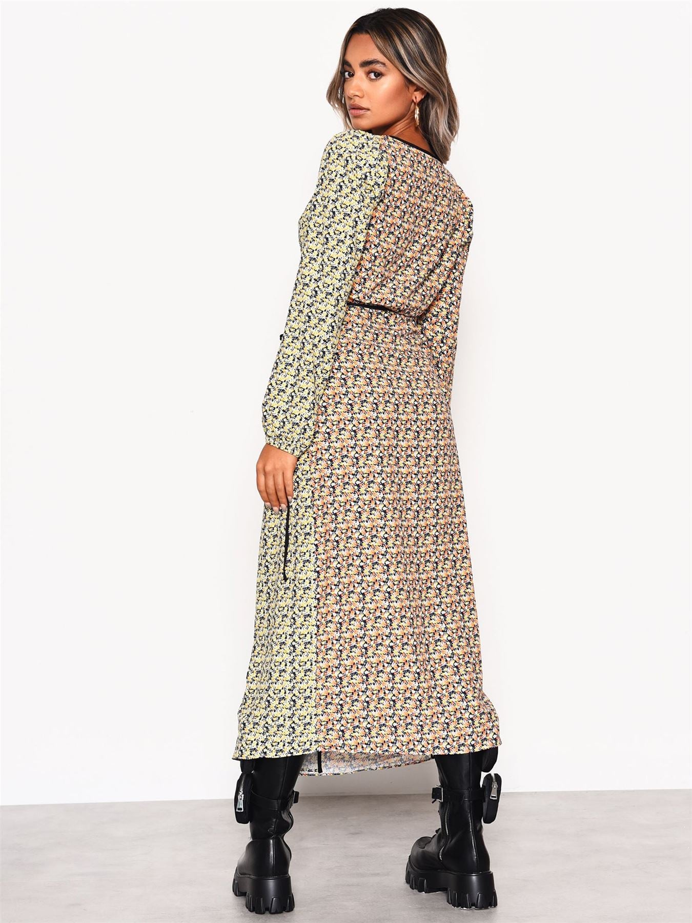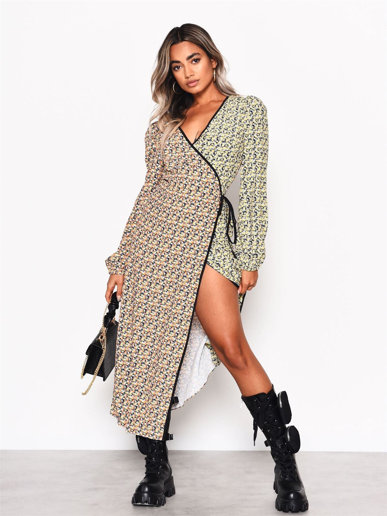 Glamorous Women's Multi Orange-Yellow Ditsy Wrap Midi-Dress. This vibrant wrap dress is perfect for adding a pop of colour to your wardrobe. The mixed print design features a playful ditsy floral pattern in shades of orange and yellow, creating a fun and eye-catching look. The wrap silhouette is both flattering and comfortable, while the long puff sleeves add a touch of drama. The midi length is versatile, allowing you to dress it up or down depending on the occasion. Whether you're heading to the office or out for a weekend brunch, this dress is sure to make you feel confident and stylish.