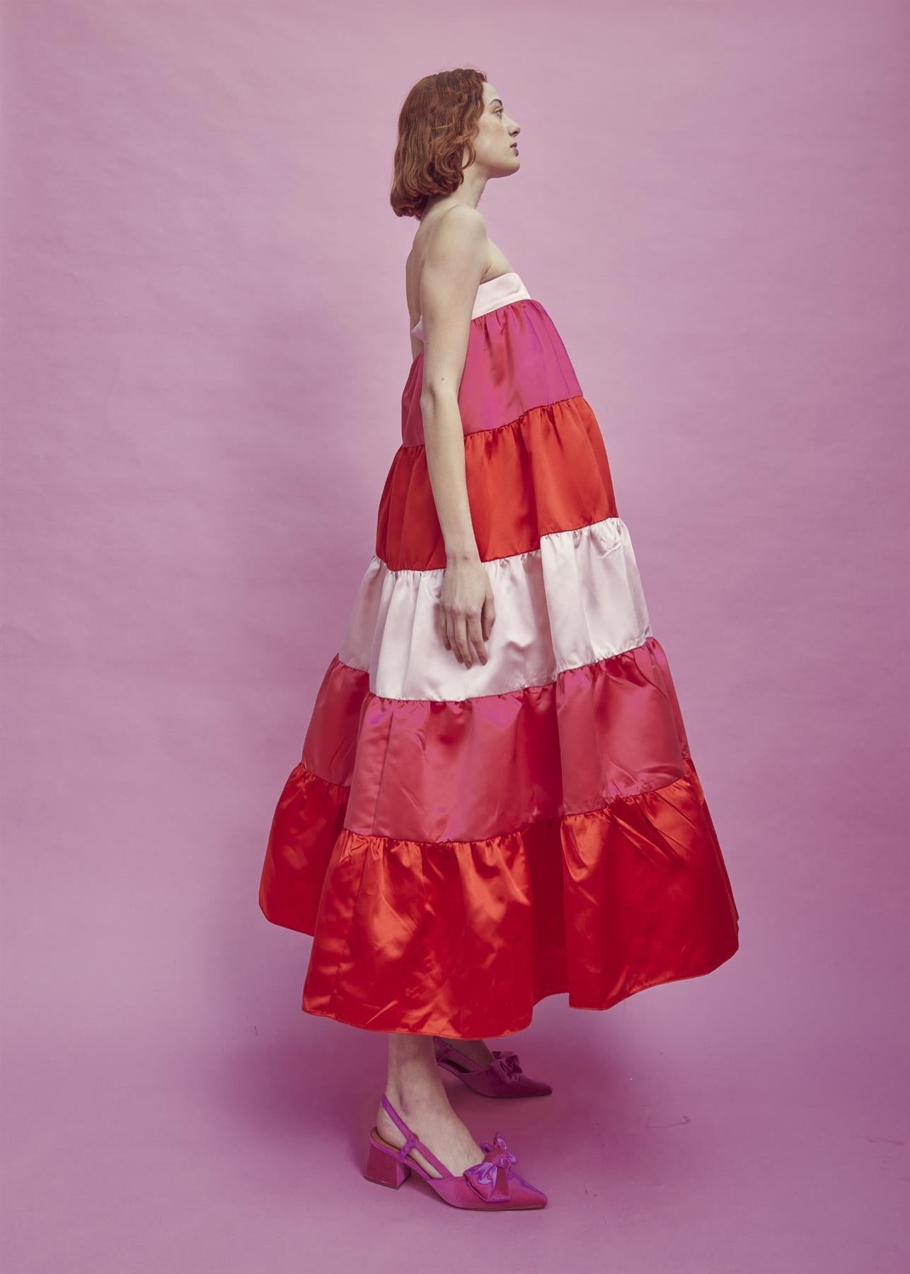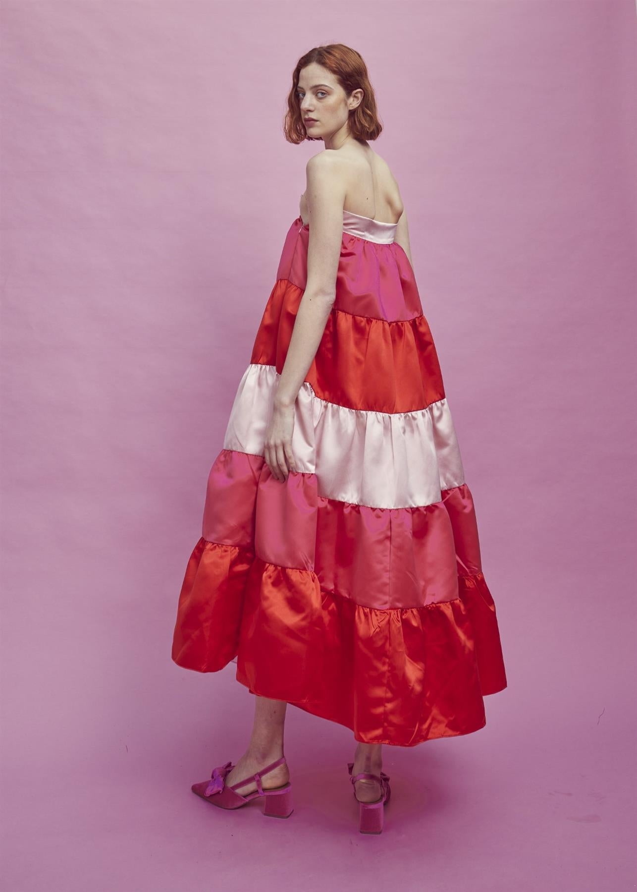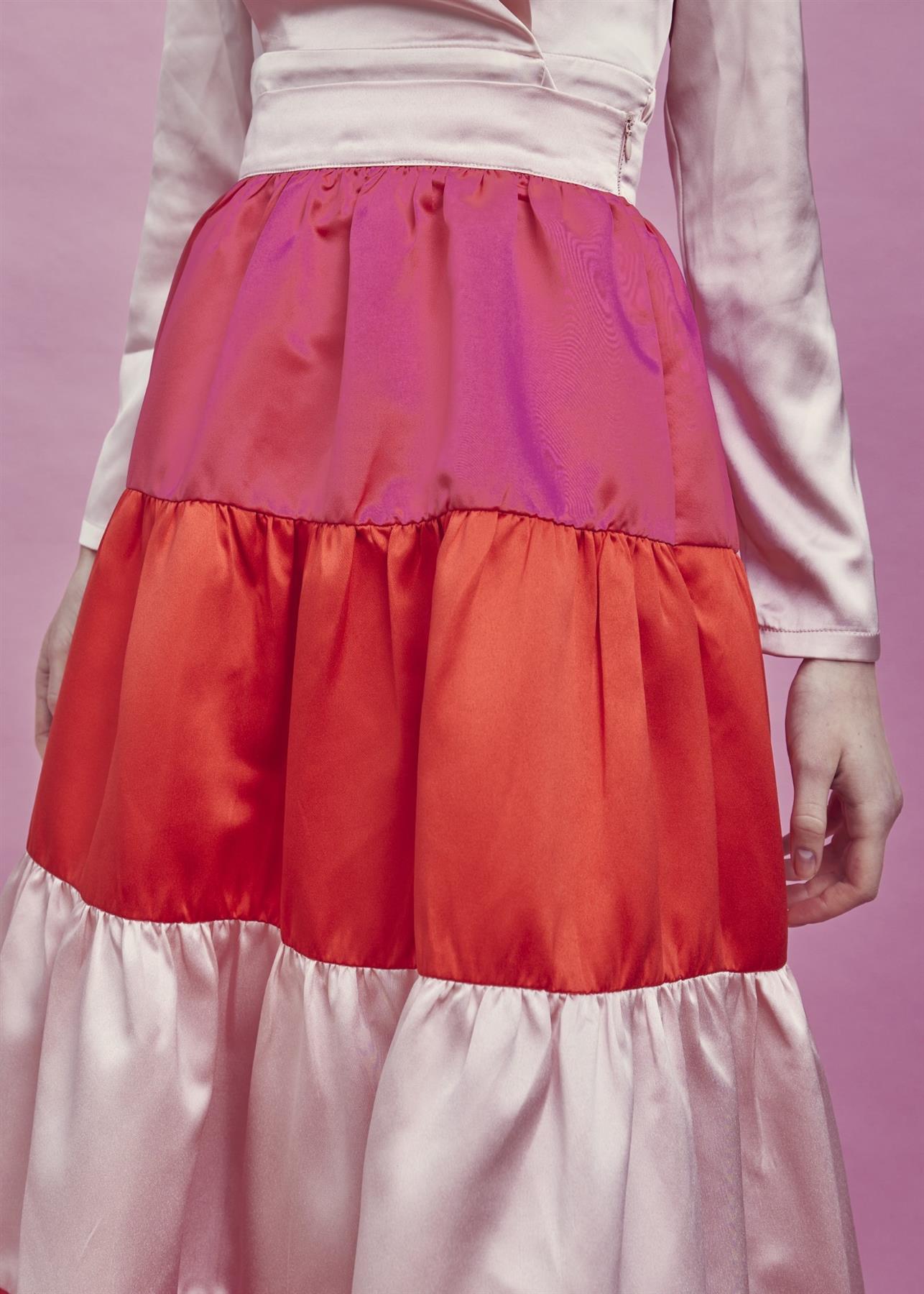 Collective the Label Women's Nancy Gathered Tiered Midi Skirt -Pink-Red. Live life in colour in this midi skirt. With a fun pink and red colour combination and a flattering full gathered skirt design, you'll be sure to turn heads wherever you go. Get ready to make a bold statement and own the night.