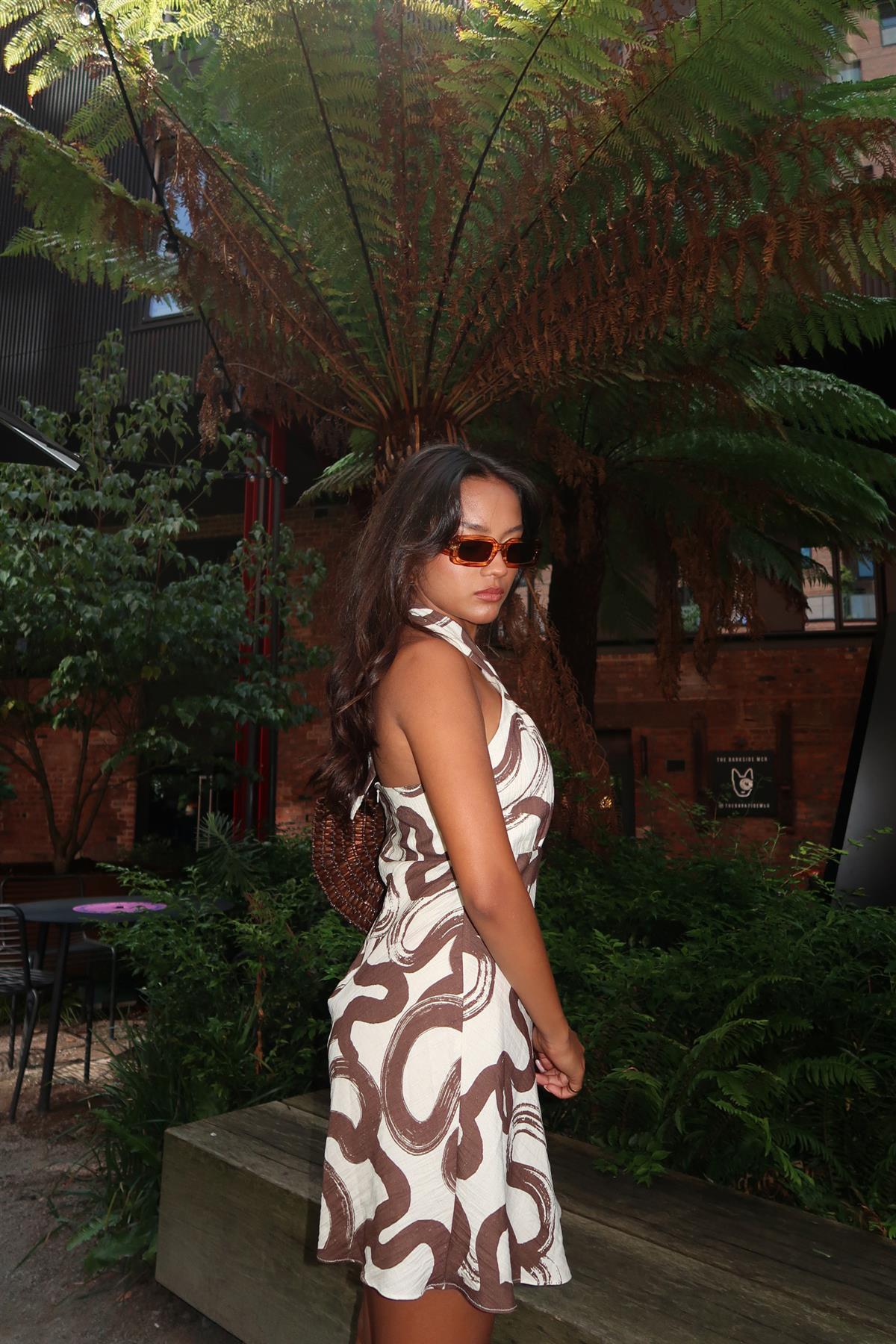 Natural-Brown-Swirl Cross-Halter-Neck Mini-Dress
