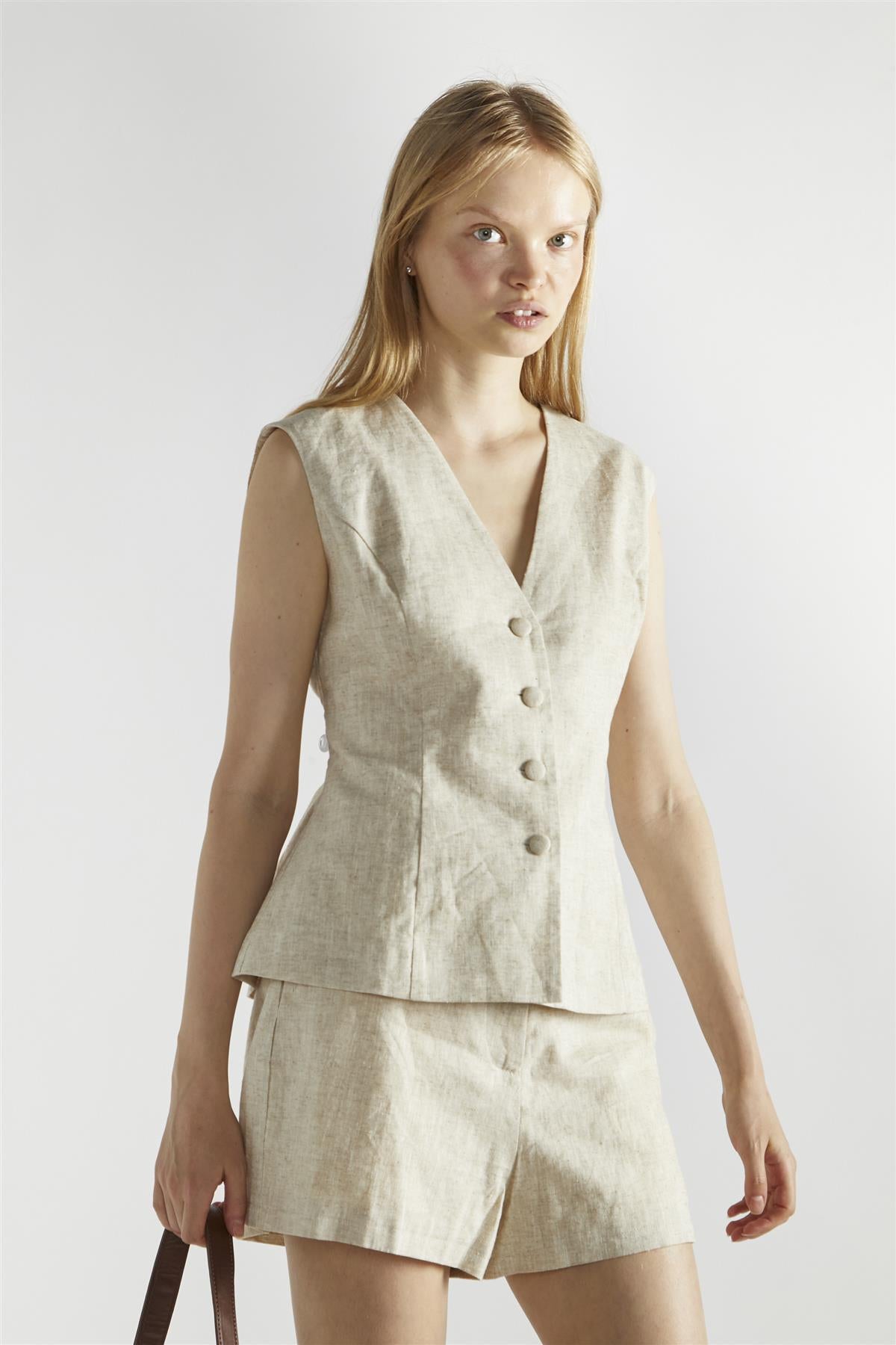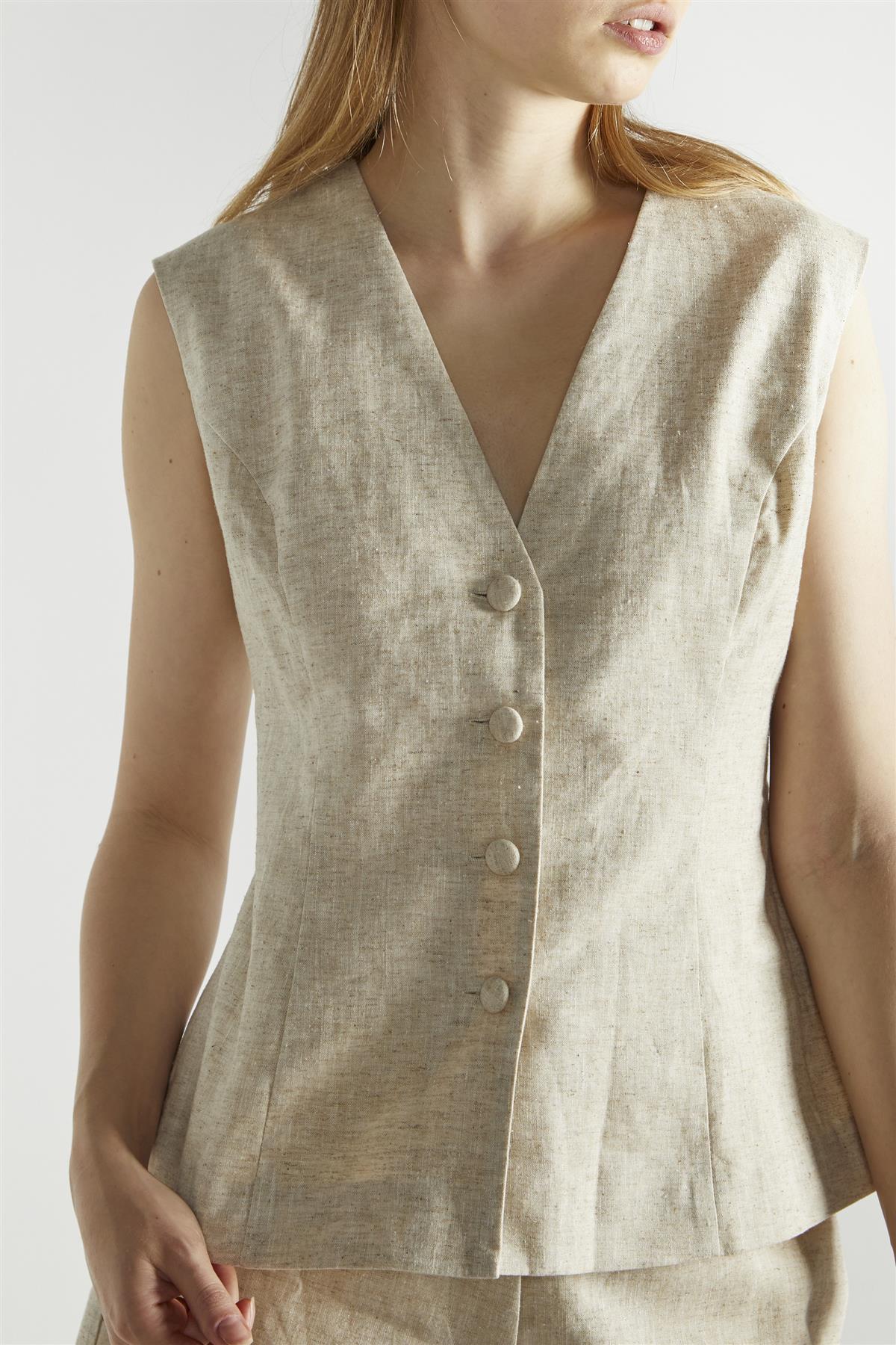 Natural Sleeveless Button Front Vest-Top