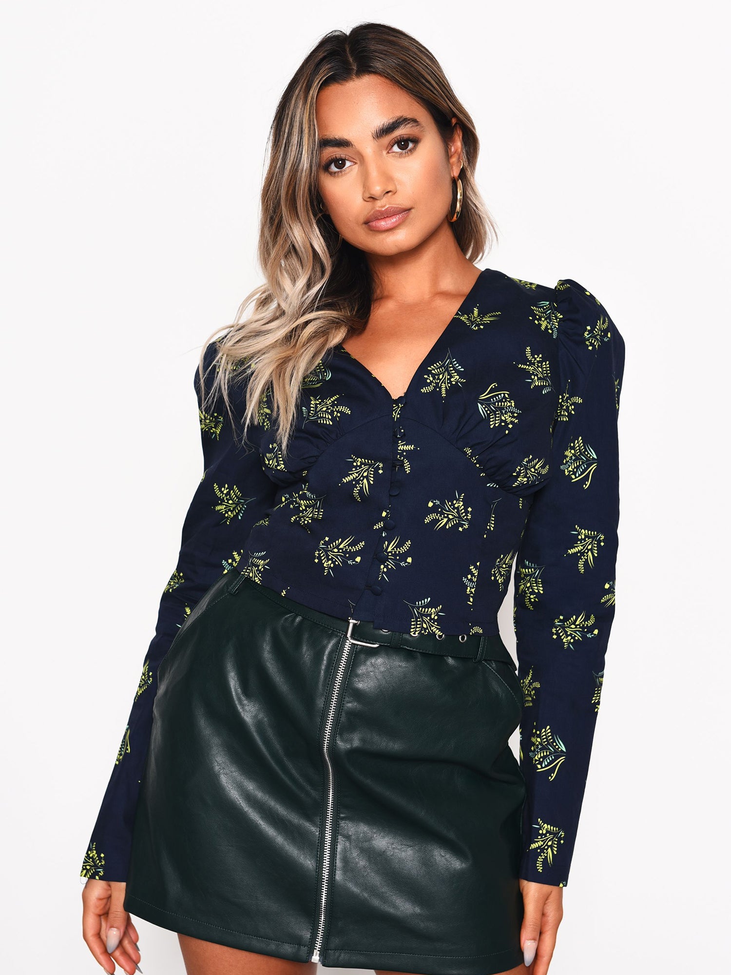 Glamorous Womens Navy Bouquet Floral Button Front Blouse. We love this contemporary style shirt, featuring gorgeous bouquet floral print. With long sleeves, V-neck and button front, this luxe navy blouse is the perfect piece to elevate your wardrobe this season. Looks great teamed with a PU Skirt and Boots for a luxe day to night look.