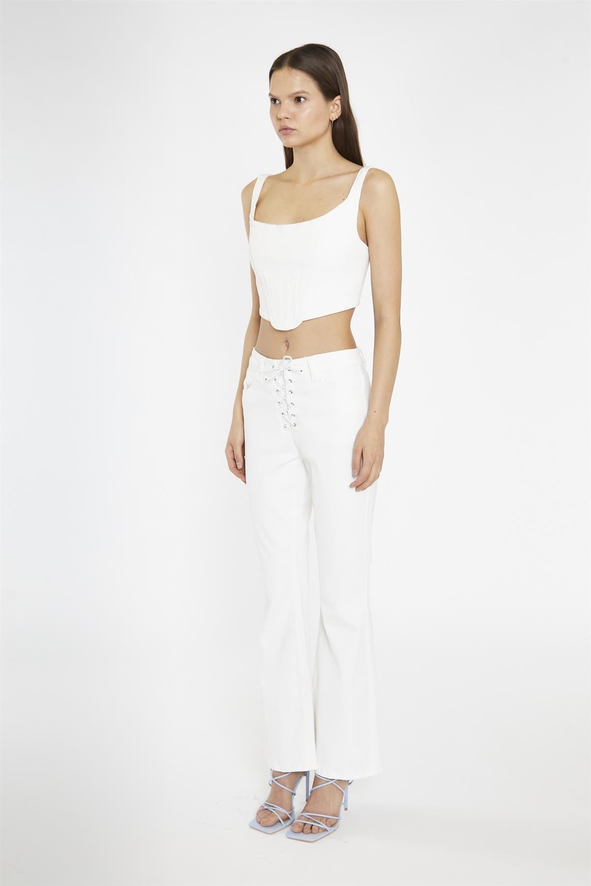 Glamorous Womens Off-White Denim Corset Top. Flaunt your curves in this playful corset top! The rounded square neckline and boning design provide structure for a flattering fit. With a zip-up back and white denim fabric, youll be turning heads all day.