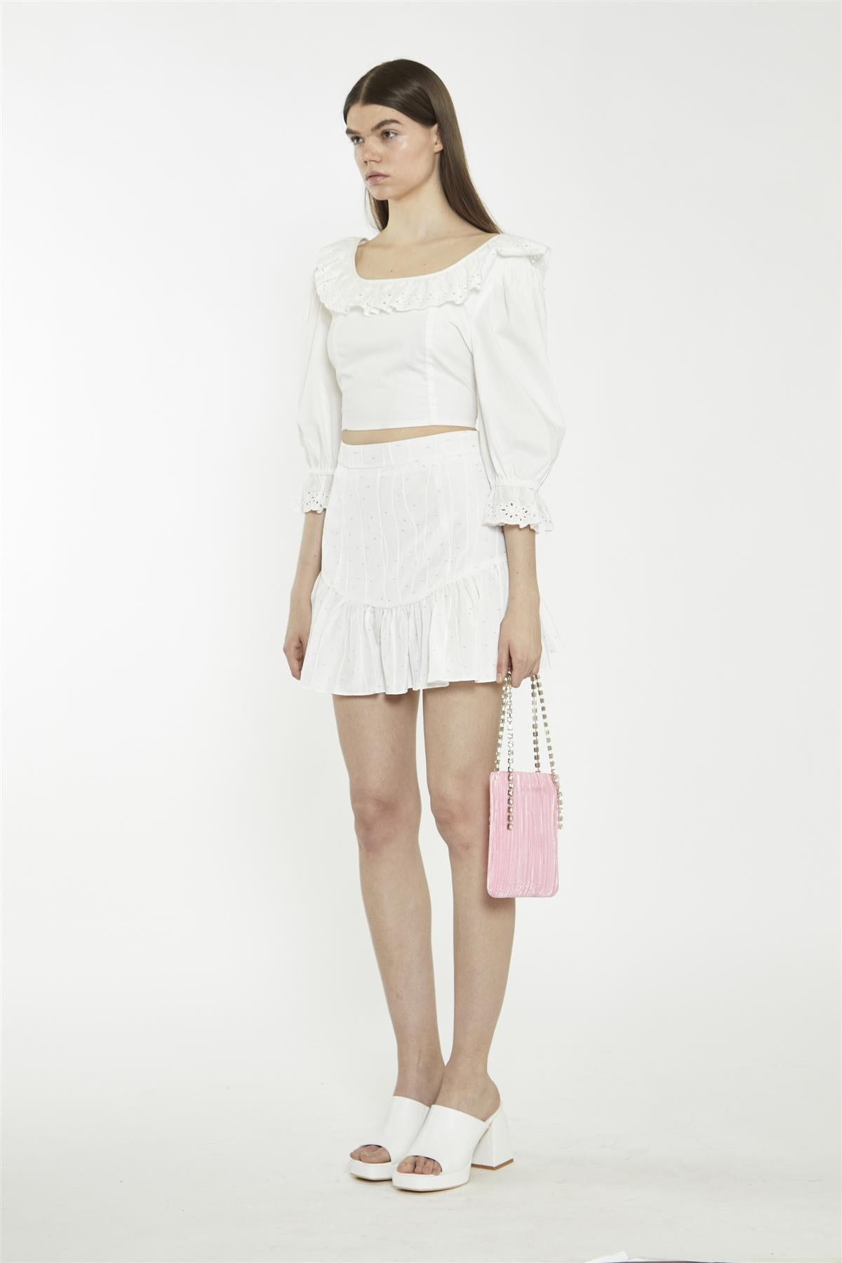 Glamorous Women's Off White Lace Frill Crop-Top. This charming crop top is a delightful blend of sweet and sassy. The square neckline frames your décolletage beautifully, while the 3/4 sleeves offer just the right amount of coverage. Delicate lace trim detailing adds a touch of romance, creating a feminine and flirty vibe. The frilly design brings movement and texture to the top, making it perfect for those who love a bit of whimsy in their wardrobe. It's a versatile piece that can easily transition from day to night - pair it with high-waisted jeans for a casual lunch date, or dress it up with the matching skirt for a coordinated look that's sure to turn heads at your next event. The crop length is just right, showing a hint of skin without being too revealing. This top is ideal for warm weather, but can also be layered under a cardigan or jacket when the temperature drops. It's the kind of piece that makes you feel instantly pretty and put-together, no matter how you style it.