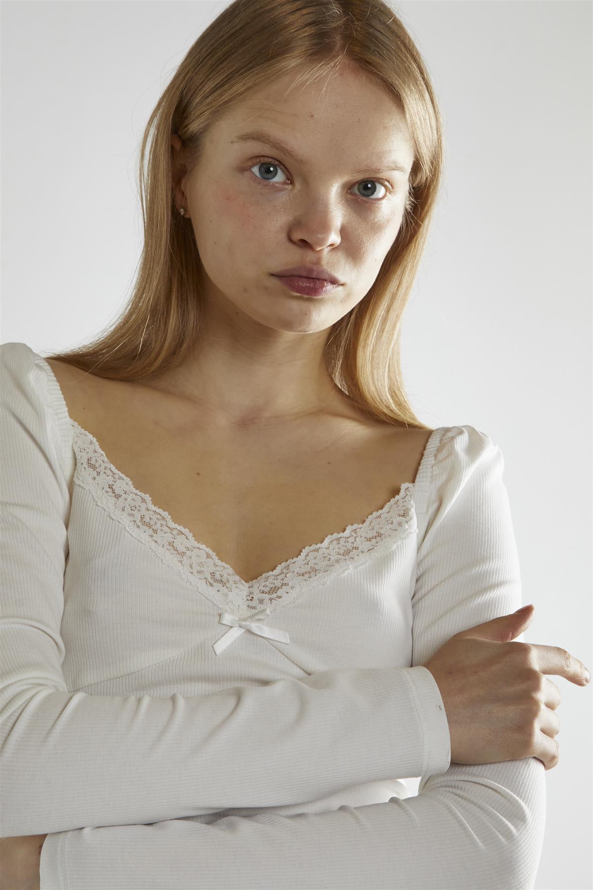 Glamorous Women's Off White Long-Sleeve Top. Our Off White Long-Sleeve Top is a beautiful blend of comfort and elegance. This lovely piece features a flattering V-neck that adds a touch of allure to your look. The standout feature is the delicate lace detailing, which gives the top a romantic and feminine flair. Long sleeves provide coverage and make this top perfect for various seasons and occasions. The off-white colour is soft and versatile, allowing you to easily mix and match with different bottoms and accessories. It's a great choice for those who appreciate a bit of subtle sophistication in their everyday wear. Pair it with jeans for a casual yet put-together look, or dress it up with a skirt for a more formal occasion. The lightweight fabric ensures you stay comfortable throughout the day, while the lace adds a touch of luxury. This top is ideal for those who love to combine classic style with a modern twist, offering a perfect balance of simplicity and charm in one beautiful package.