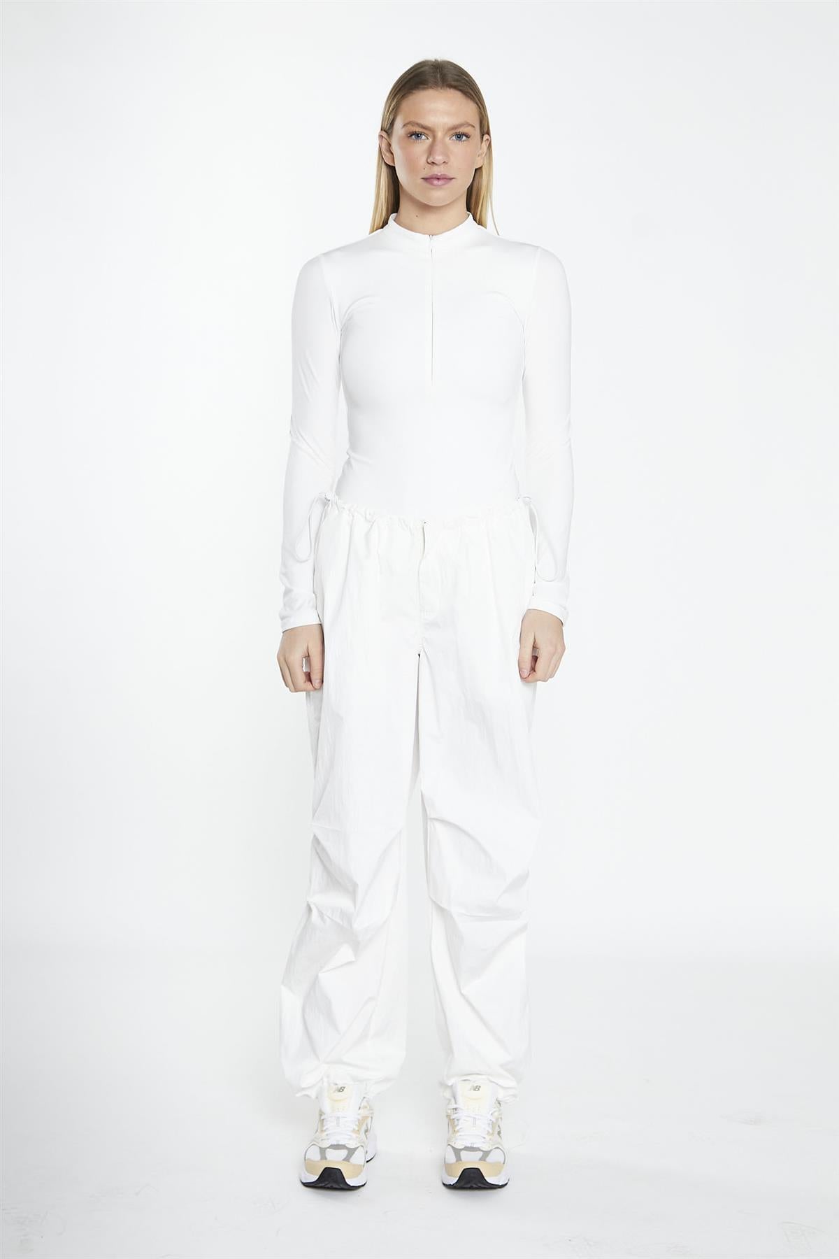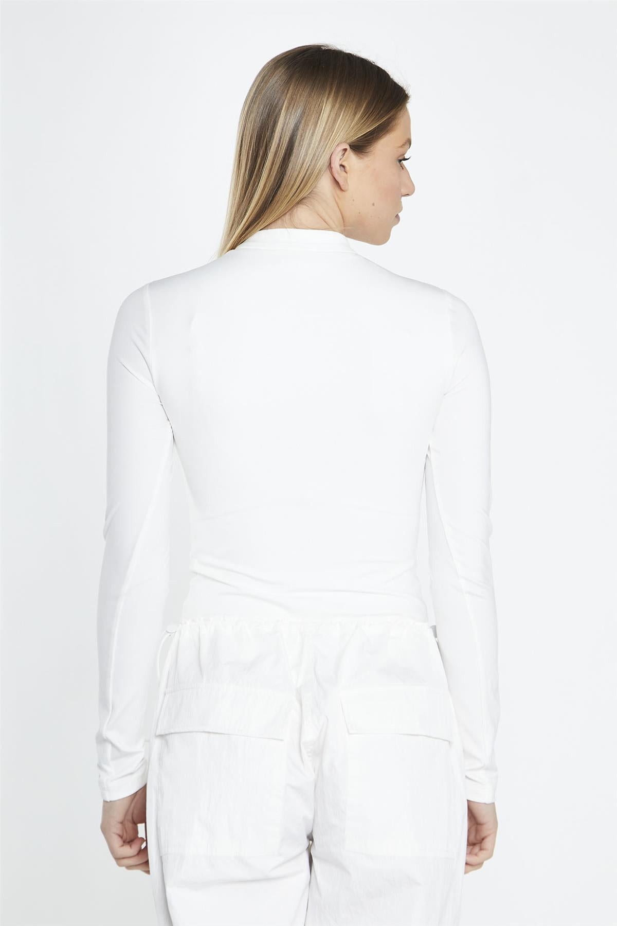 Glamorous Women's Off White Long-Sleeve Zip-Up Bodysuit. Dress to impress in this perfect Off White Long-Sleeve Zip-Up Bodysuit! This bodycon fit will hug all the right curves, while the high neck and long sleeves provide a look that’s chic-yet-comfy. Style under one of our perfectly tailored suit sets for a that modern city girl look!