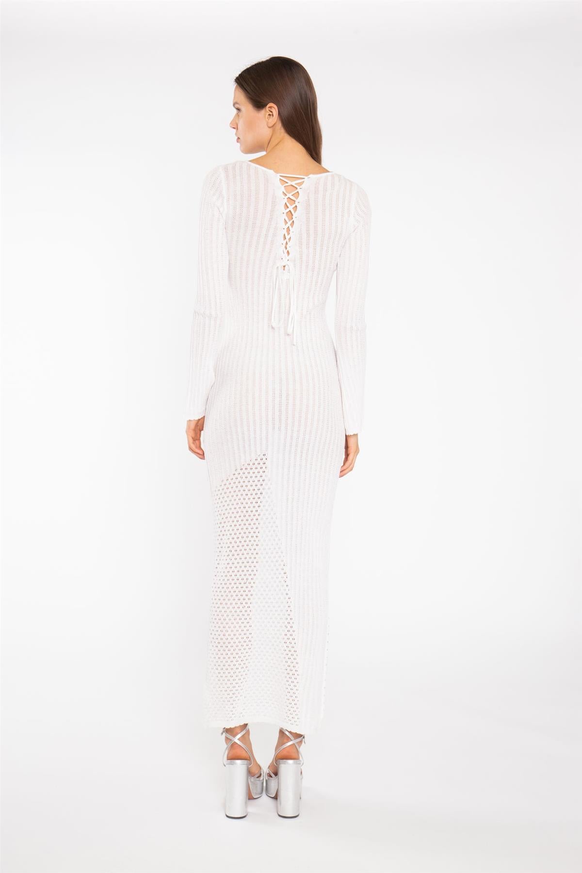 Glamorous Women's Off White Mix Knit Maxi-Dress. Treat yourself to an off-white showstopper with the Off White Mix Knit Maxi-Dress! Featuring a boat neckline and lace-up back, this dreamy dress amps up the drama and totally channels your boho vibes. Flared sleeve details and mix-knit techniques combine to create a show-stopping look – the perfect all day look.