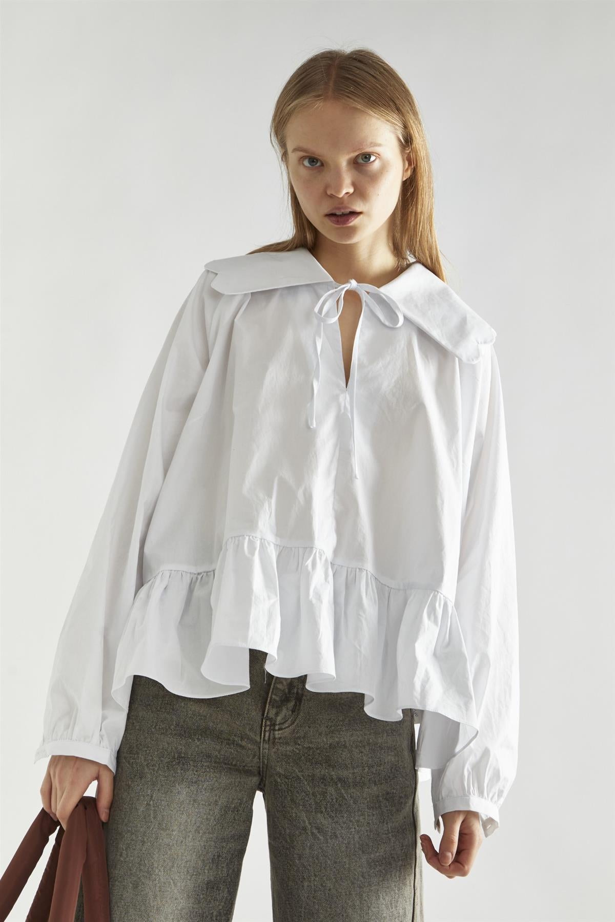 Glamorous Women's Off-White Oversized-Collar Blouse. Refresh your wardrobe with this charming off-white oversized-collar blouse, a delightful piece that combines comfort and style. The standout oversized collar features a scalloped edge, adding a touch of whimsy to your outfit. The tie neck detail offers a playful twist, allowing you to adjust the fit to your preference. With long sleeves and a gathered peplum hem, this blouse creates a flattering silhouette that flows beautifully with your movements. Pair it with fitted jeans for a balanced look, or style it with a high-waisted skirt for a more polished ensemble. This versatile blouse is perfect for everything from casual brunches to office meetings, making it a great addition to your collection. With its soft fabric and unique design, you’ll feel both comfortable and stylish, ready to take on the day with confidence!