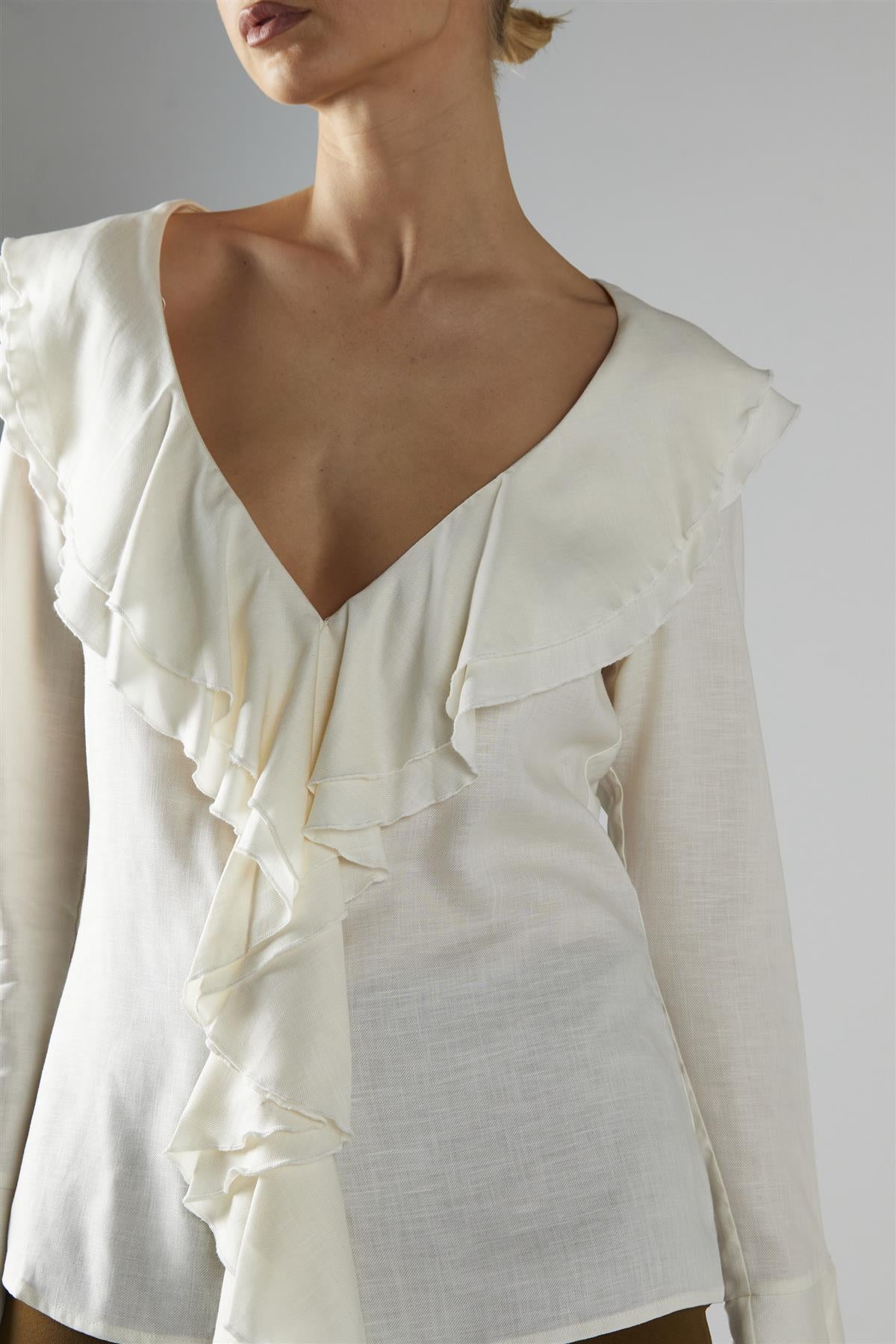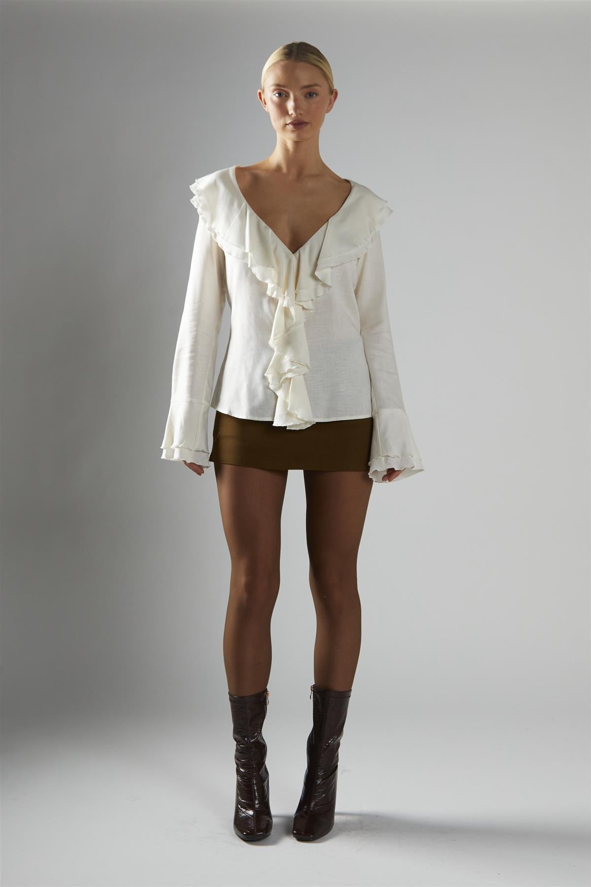 Glamorous Women's Off-White Ruffle-Front Blouse. This ruffle-front blouse brings a gentle sense of movement and charm to your wardrobe, thanks to its flowing ruffle details that cascade from the deep V-neckline. The airy fabric drapes softly, offering a comfortable fit that feels relaxed yet thoughtfully designed. The deep V-neck adds a touch of drama without being over the top, making it easy to layer with delicate jewellery or a simple camisole underneath. Ruffle accents along the front create subtle texture, catching the light and adding interest to even the simplest outfits. Pair it with tailored trousers for a look that feels polished but never fussy, or tuck it into your favourite skirt for an easy, breezy style. This blouse is all about effortless confidence—ready to brighten up your day with just the right amount of detail and a softly supportive feel.