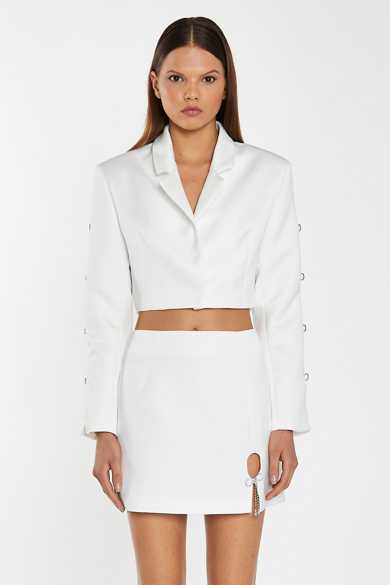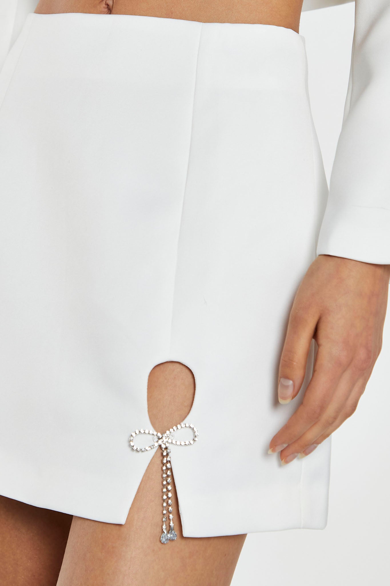 Glamorous Womens Off-White Satin Diamante Bow Mini-Skirt. Slip into something a little more chic with this Diamante Bow Mini-Skirt! Crafted with a luxurious satin fabric and featuring a sparkly diamante bow detail with front side split, this mini-length skirt will take your next event look to the next level. Style it with the matching top for a look thats luxe and sassy!