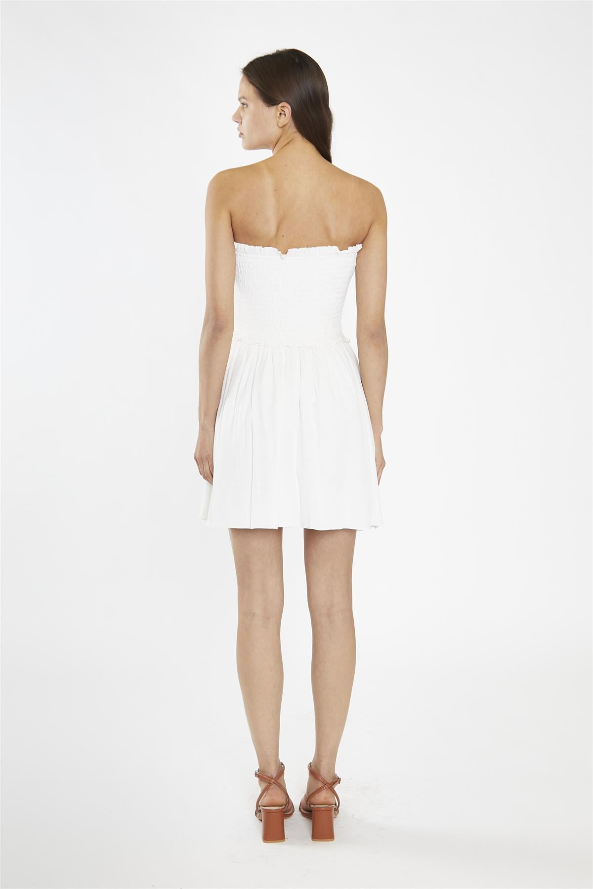 Glamorous Off-White Smocked Mini-Dress. Get ready to turn heads in our Off-White Smocked Mini-Dress, a charming piece that combines comfort and style in one adorable package. This dress features a flattering smocked bodice that hugs your curves in all the right places, while the unique V-shaped waistline adds a touch of visual interest and elongates your silhouette. The gathered skirt creates a playful and flirty look, perfect for twirling on the dance floor or strolling through a summer market. The strapless design shows off your shoulders and keeps you cool on warm days, while the mini length lets you flaunt your legs with confidence. The off-white colour is versatile and easy to accessorize, making this dress a blank canvas for your personal style. Pair it with colourful sandals and a statement necklace for a fun daytime look, or dress it up with heels and a clutch for a night out. The lightweight fabric ensures you stay comfortable all day long, no matter where your adventures take you. This Off-White Smocked Mini-Dress is more than just a piece of clothing - it's a mood-booster that'll make you feel confident and carefree every time you slip it on..