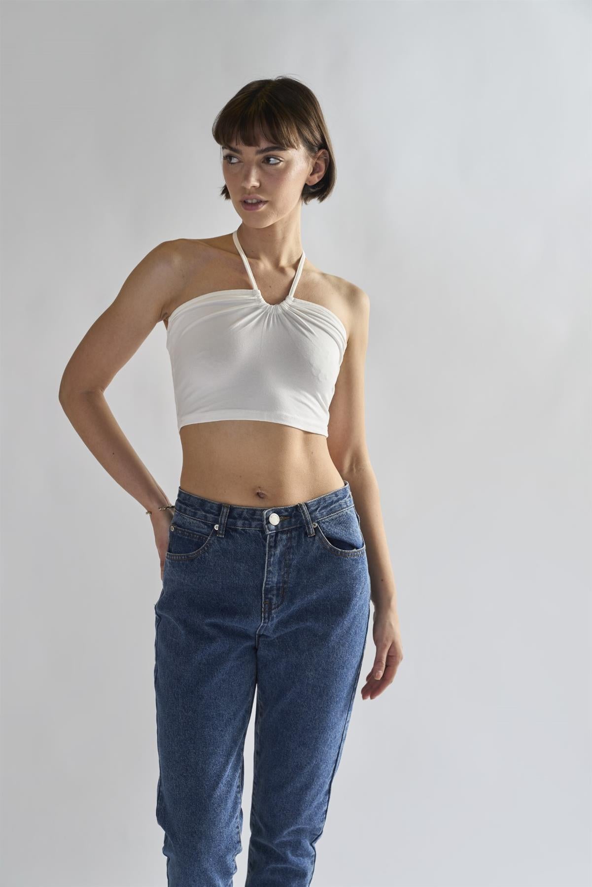 Off-White Tie Neck Halter Crop-Top