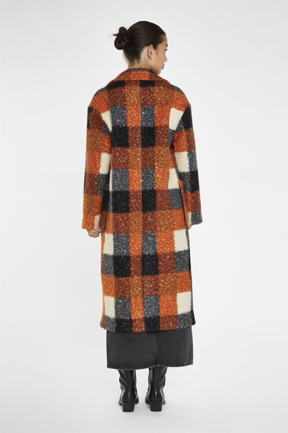 Glamorous Women's Orange Multi-Check Double-Breasted Coat. Wrap yourself in style with our Orange Multi-Check Double-Breasted Coat. This eye-catching piece features a bold, vibrant check pattern that's sure to turn heads. The double-breasted design and lapel collar add a touch of classic elegance, while the longline length provides ample coverage and warmth. Slip your hands into the convenient patch pockets as you brave the colder weather. Pair this statement coat with your favourite jeans and boots for a chic, casual look, or dress it up with a midi dress and heels for a night out. Crafted with high-quality materials, this coat is both stylish and durable, ensuring you can enjoy it season after season.