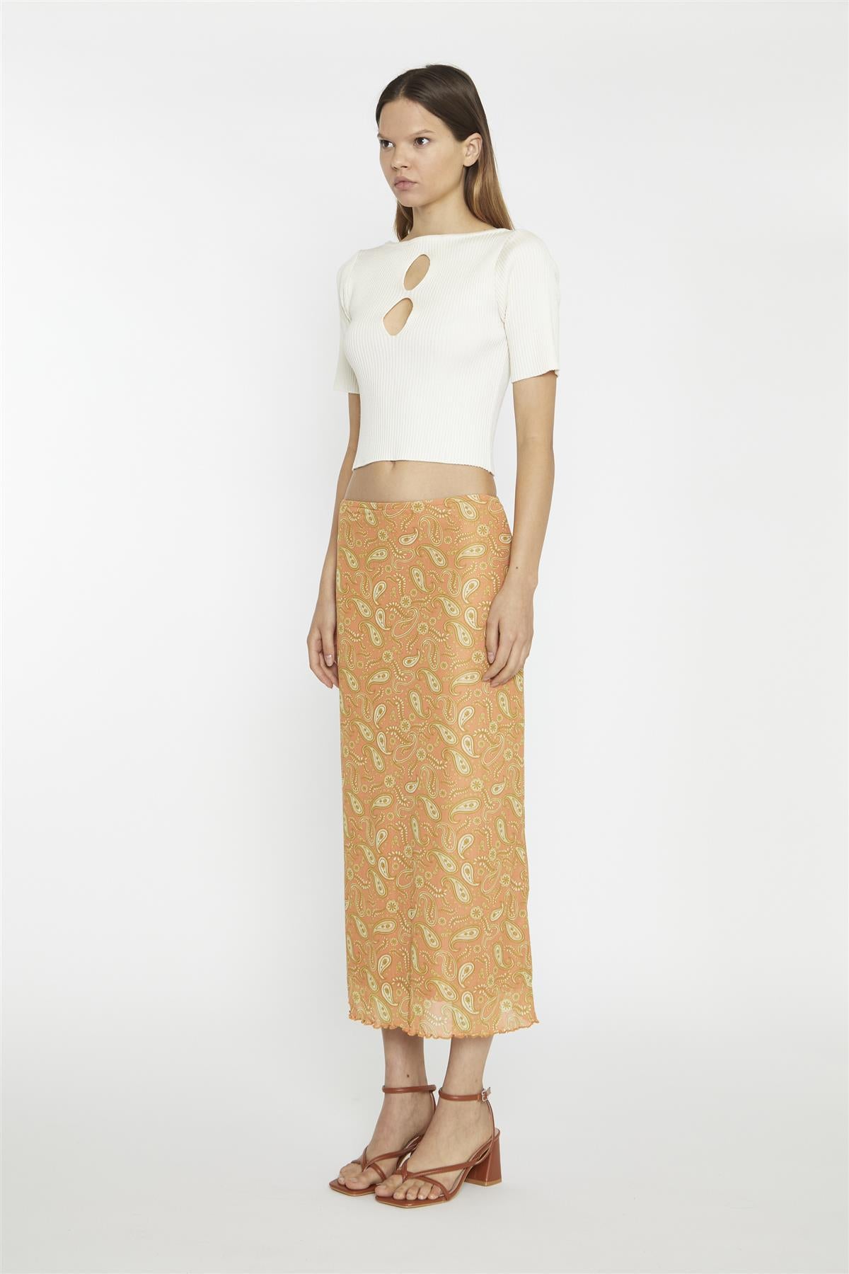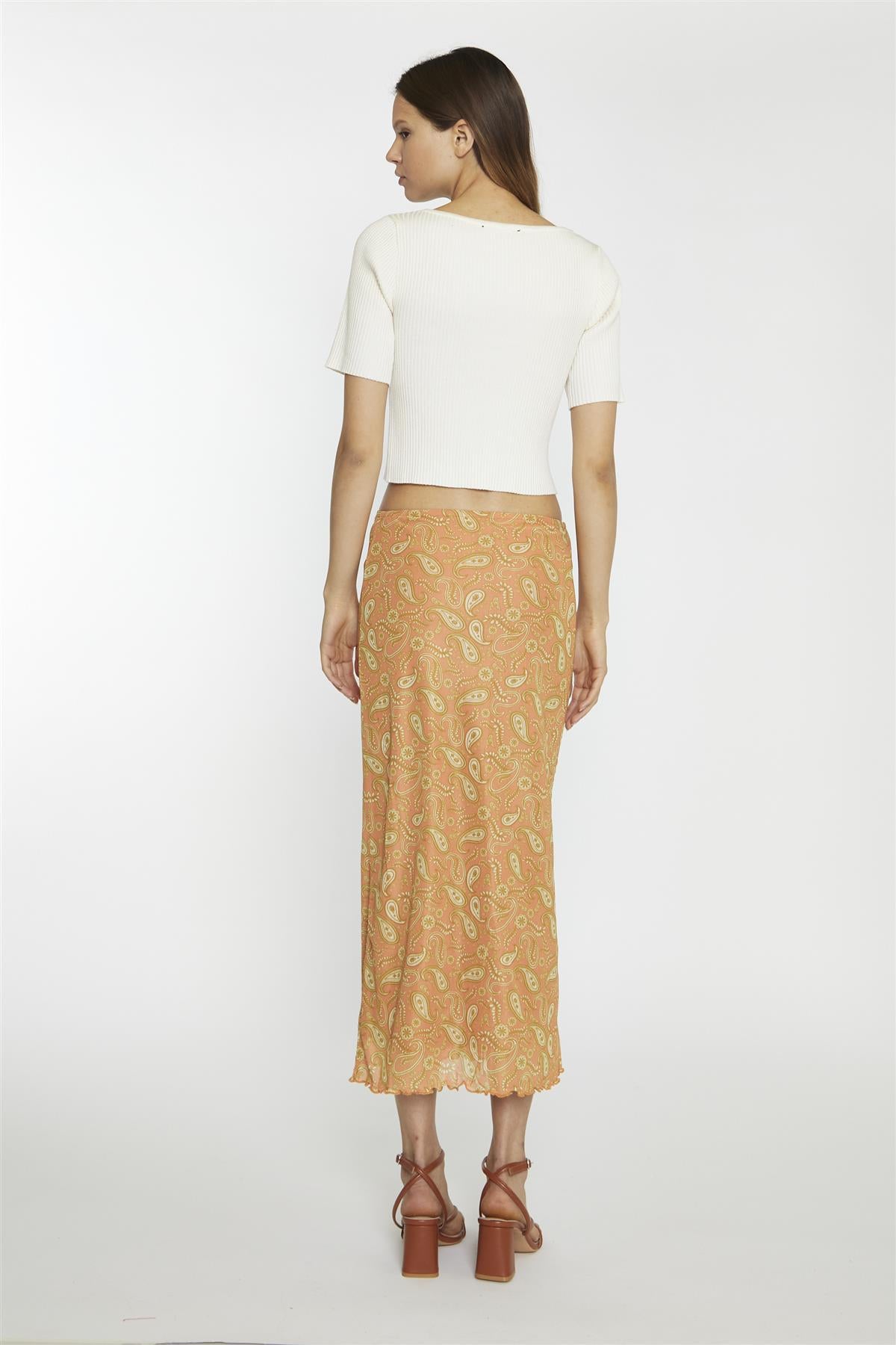Glamorous Women's Orange Olive Paisley Mesh Low Rise Midi-Skirt . This eye-catching midi skirt is a true statement piece for your wardrobe. The vibrant paisley pattern swirls across the mesh fabric, creating a mesmerising visual effect that's sure to turn heads. Its low-rise design sits comfortably on your hips, offering a modern and trendy silhouette. The playful lettuce hem adds a touch of whimsy and movement to the skirt, making it perfect for twirling on the dance floor or strolling through a summer market. The mesh material provides a light and airy feel, ideal for warm days when you want to look stylish without sacrificing comfort. This skirt is versatile enough to dress up or down - pair it with a simple crop top and sandals for a casual day out, or team it with a sleek bodysuit and heels for a night on the town. The midi length offers just the right amount of coverage while still showing off your favourite shoes. It's the kind of piece that instantly boosts your mood and confidence, bringing a touch of bohemian charm to your everyday looks.