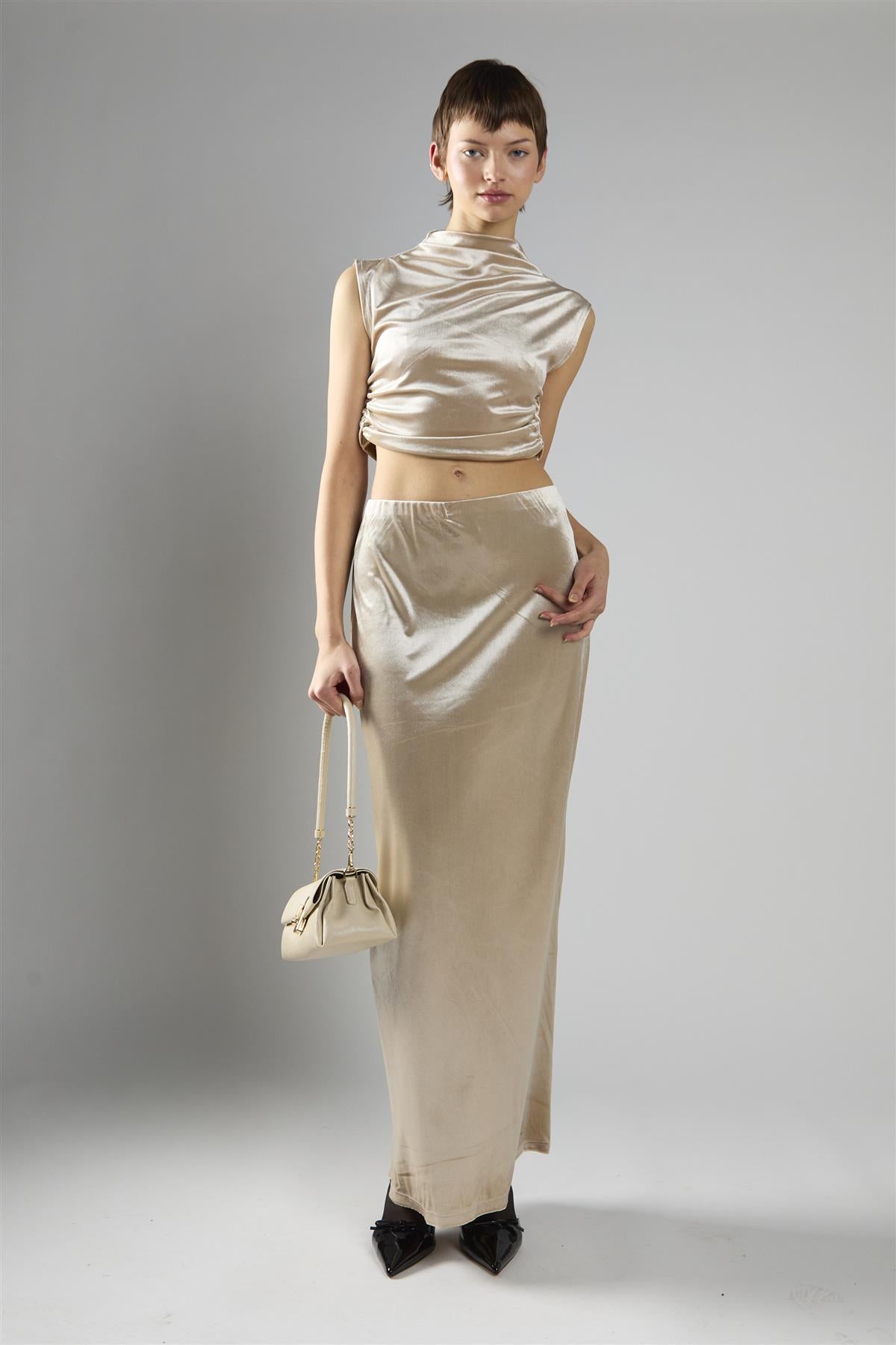 Glamorous Women's Oyster Velvet Mid-Rise Maxi Skirt. Step into effortless comfort and timeless elegance with this mid-rise maxi skirt crafted from soft oyster velvet, designed to move with you while keeping style simple and chic. The maxi length creates a graceful, elongating silhouette, while the elasticated waistband ensures a comfortable, flattering fit all day long. Perfect for pairing with its matching high-neck crop oyster velvet top, this skirt adapts easily to a variety of occasions, letting you feel polished without sacrificing ease. Its versatile design makes layering and styling a breeze, offering a relaxed yet sophisticated look that naturally elevates your wardrobe.