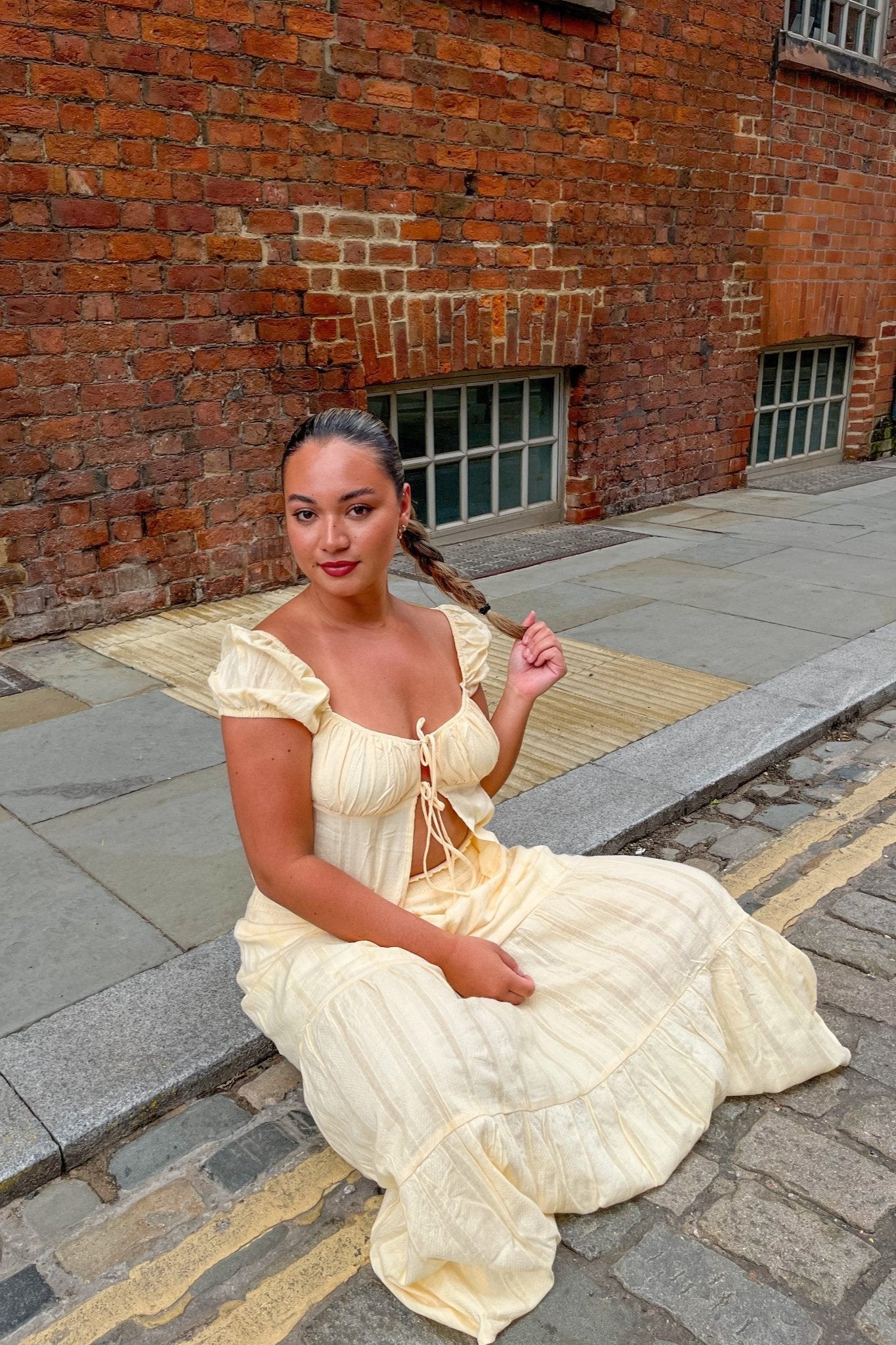 Glamorous Pale-Lemon Tie-Front Top. Step into summer with our Pale-Lemon Tie-Front Top. This charming piece features a flattering milkmaid style bust, adding a touch of vintage flair to your look. The tie-front detail allows you to adjust the fit to your liking, while the puff sleeves bring a playful and feminine element to the design. For a complete ensemble, pair this top with our matching Pale-Lemon Tiered Maxi-Skirt. The combination creates a breezy, coordinated outfit perfect for warm days and outdoor events. The soft lemon hue is sure to brighten your mood and your wardrobe. This versatile top can easily transition from day to night. Wear it with jeans for a casual lunch date, or dress it up with the matching skirt for a garden party. The lightweight fabric ensures comfort throughout the day, making it a go-to choice for your summer adventures..