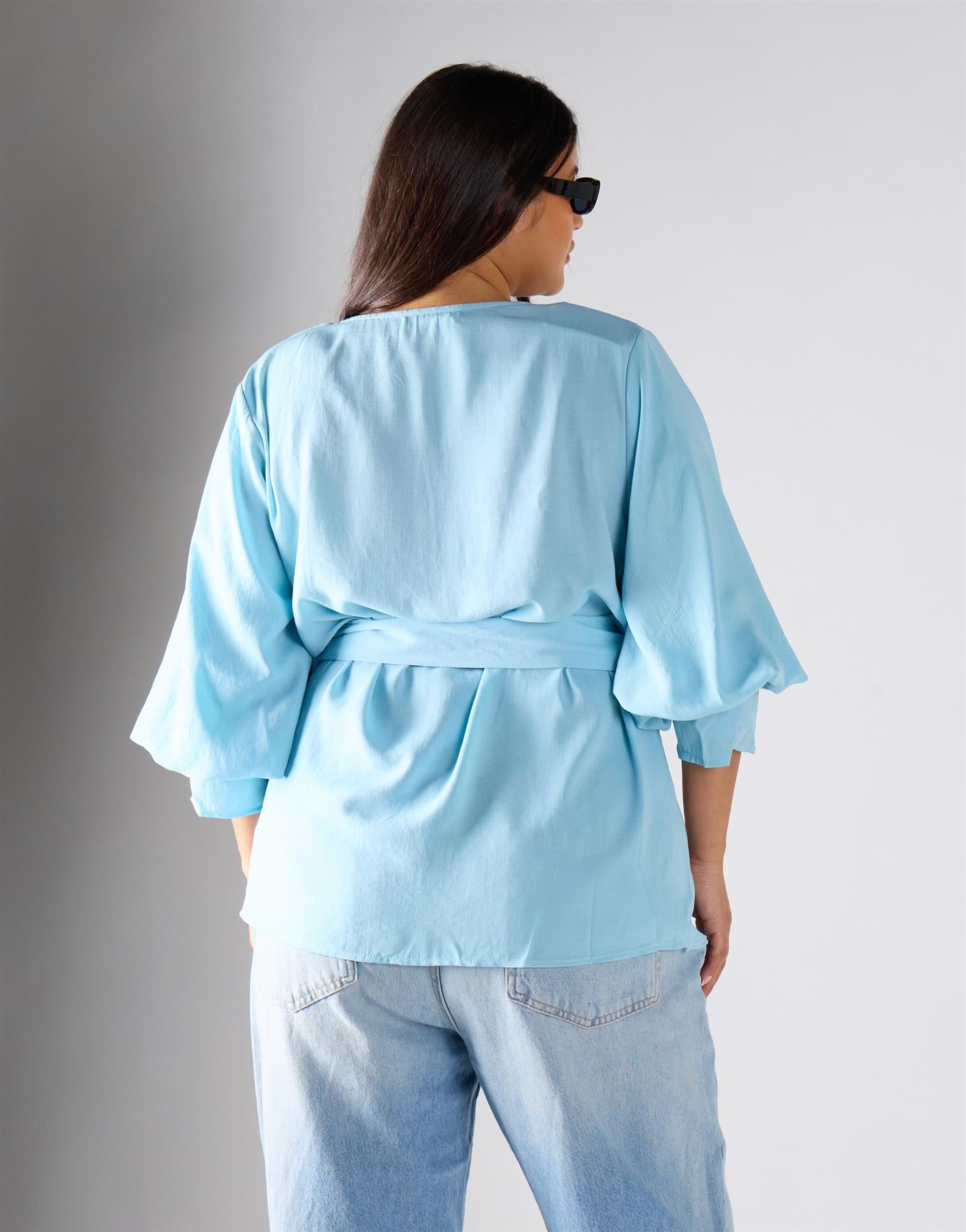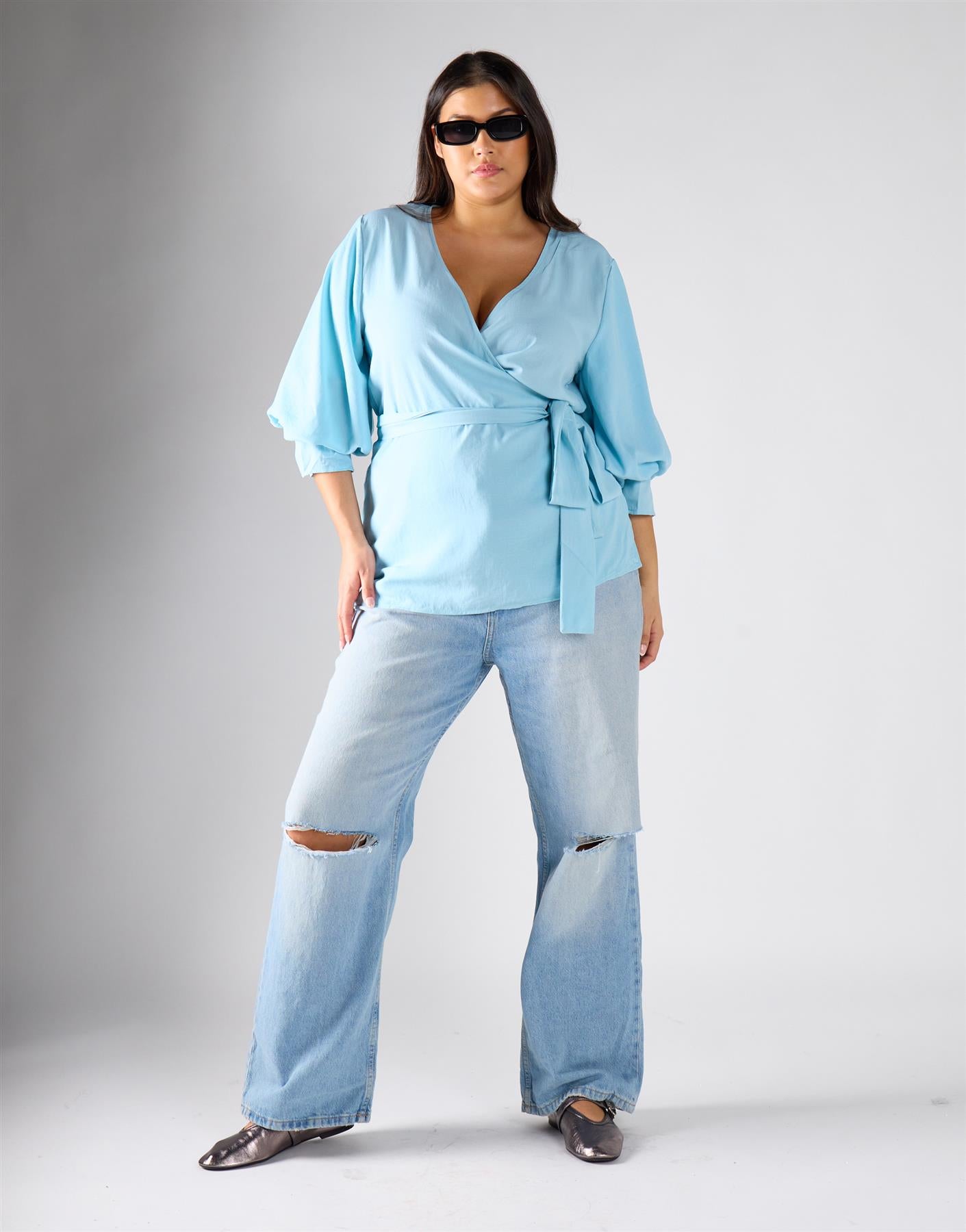 Glamorous Curve Women's Pastel Blue Wrapped Top. Effortless style meets everyday comfort in this pastel blue wrapped top, designed to give you a flattering silhouette without any fuss. The kimono wrap shirt brings a relaxed, elegant feel, while the tie-waist belt allows you to adjust the fit for a look that feels tailored just for you. Long sleeves add versatility, making it easy to layer or wear alone with confidence. Adjustable straps ensure the perfect fit, so you feel comfortable and supported all day. Style with tailored trousers or a simple skirt to highlight the wrap detail and create a polished, approachable outfit.