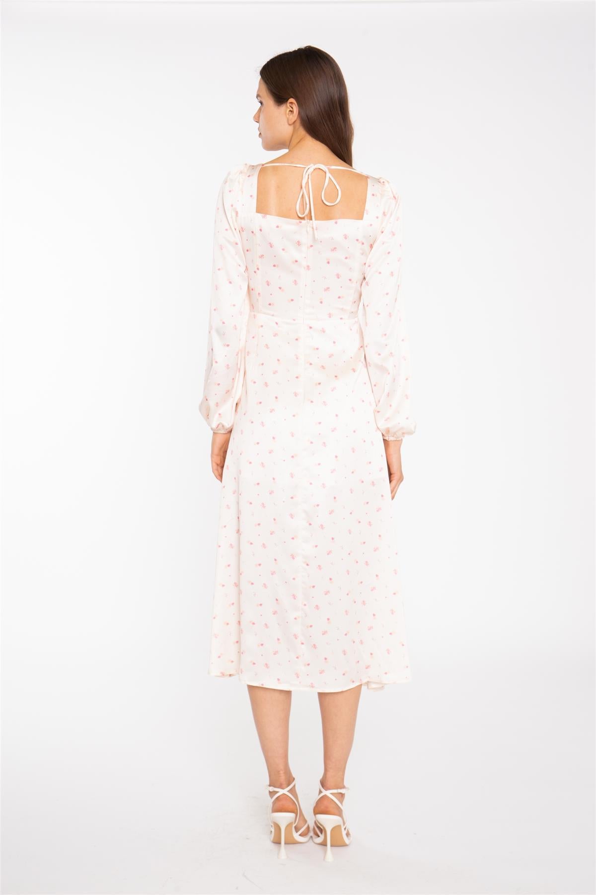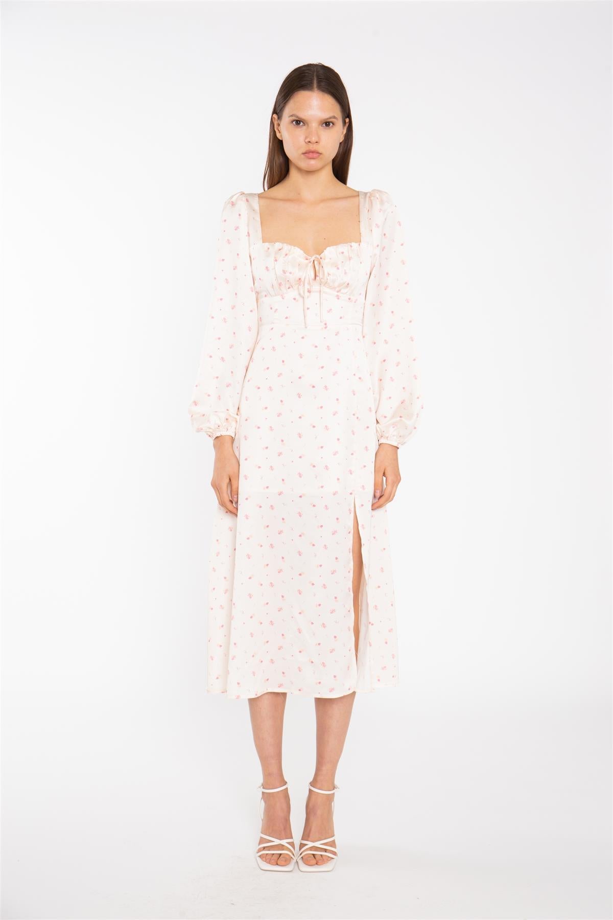 Glamorous Women's Peach-Pink Daisy Milkmaid Midi-Dress. Blossom into a vision of romantic charm with our Peach-Pink Daisy Milkmaid Midi Dress. This delightful piece features a whimsical daisy print, evoking the essence of a sun-kissed garden. The ruched bust design and fitted waist create a flattering silhouette, while the long puff sleeves add a touch of vintage-inspired elegance. A front side split offers a hint of movement. A Concealed zip fastening at the back ensures a seamless fit, and the full lining provides comfort. Style it with strappy sandals for a romantic summer soirée or pair it with ankle boots for a bohemian-chic vibe.