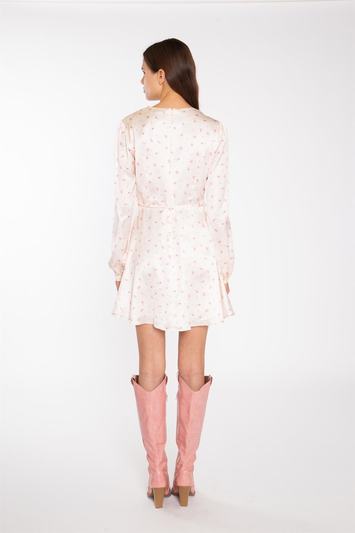 Glamorous Women's Peach-Pink Daisy V-Neck Mini-Dress. Radiate warmth and femininity in this delightful peach-pink mini-dress. Crafted with a flattering V-neckline and a tie waist that cinches your silhouette, it exudes effortless charm. Long sleeves provide coverage, while the mini length keeps you feeling breezy. Fully lined for comfort, it features a concealed back zip for easy dressing. Available in multiple hues, this dress is a versatile addition to your spring wardrobe, perfect for brunch dates or garden parties.