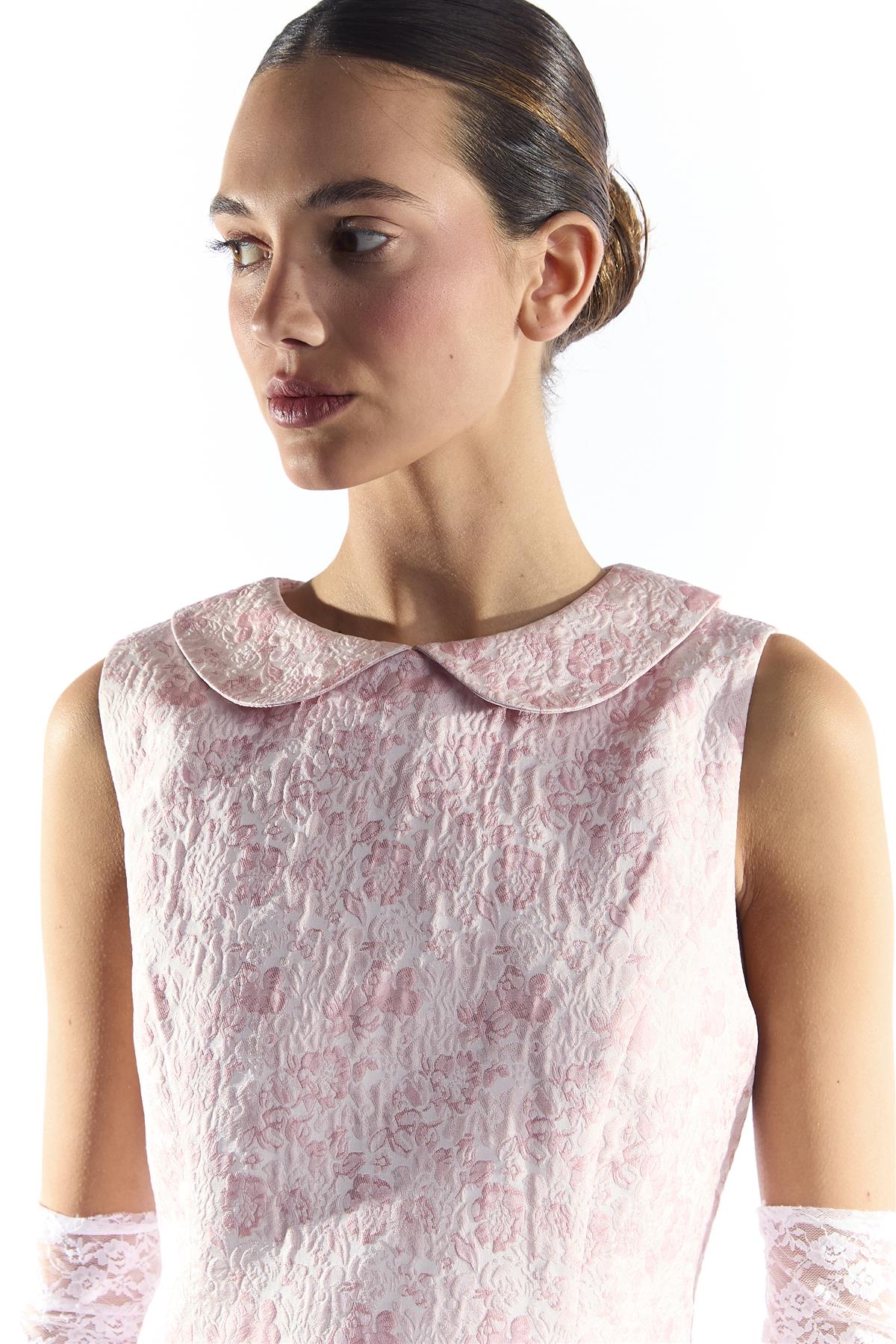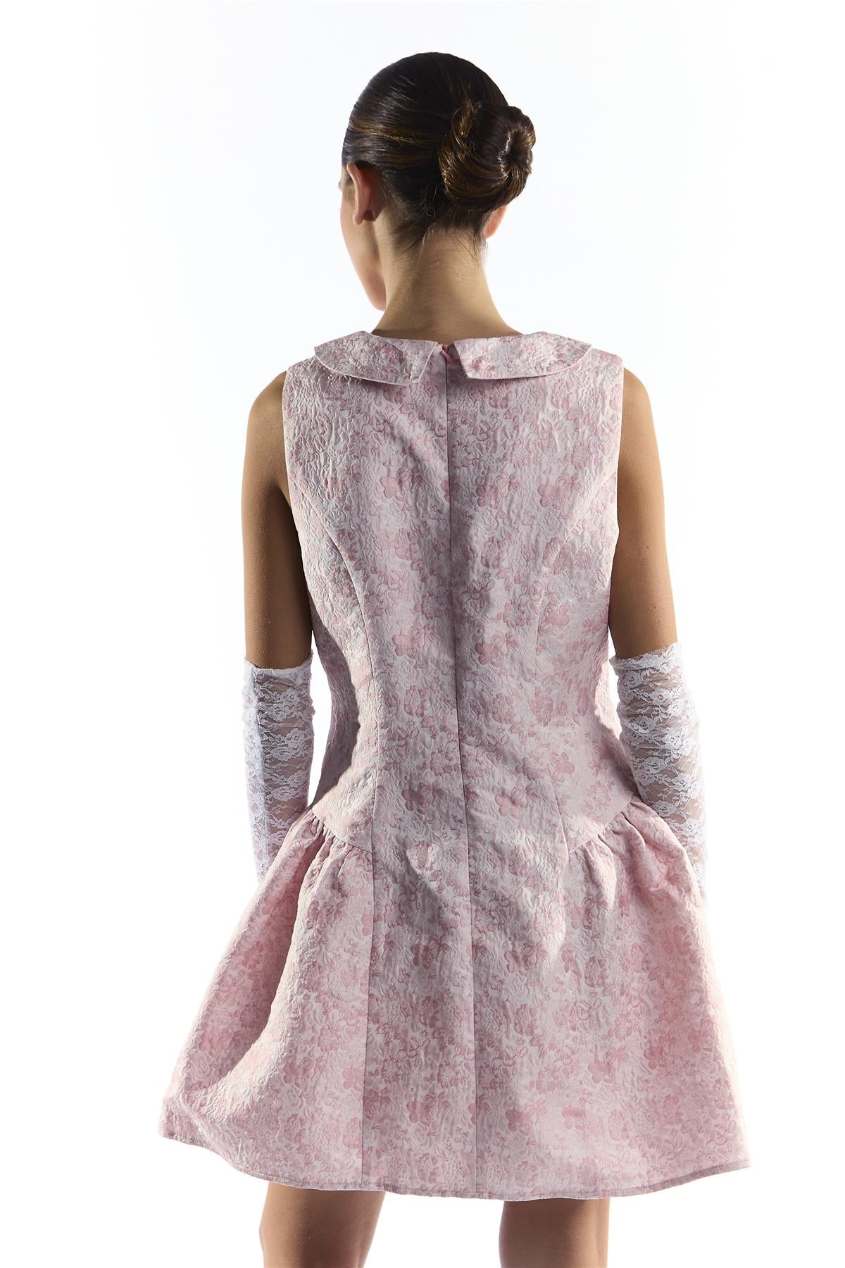 Collective the Label Women's Pink Floral Brocade Collared Minin Dress with Dropped Waist. Bring a touch of playful sophistication to your wardrobe with this Pink Floral Brocade Collared Mini Dress. The sleeveless design offers freedom of movement and a breezy, comfortable fit, while the structured collar adds a polished, refined touch. The dropped waist creates a flattering silhouette that enhances your natural shape and adds a subtle, modern twist to a classic mini dress. Perfect for dressing up or down, this piece allows you to feel confident and stylish effortlessly. Style with your favourite accessories or shoes to create a look that reflects your personality while enjoying a dress that balances elegance and ease in one chic design.