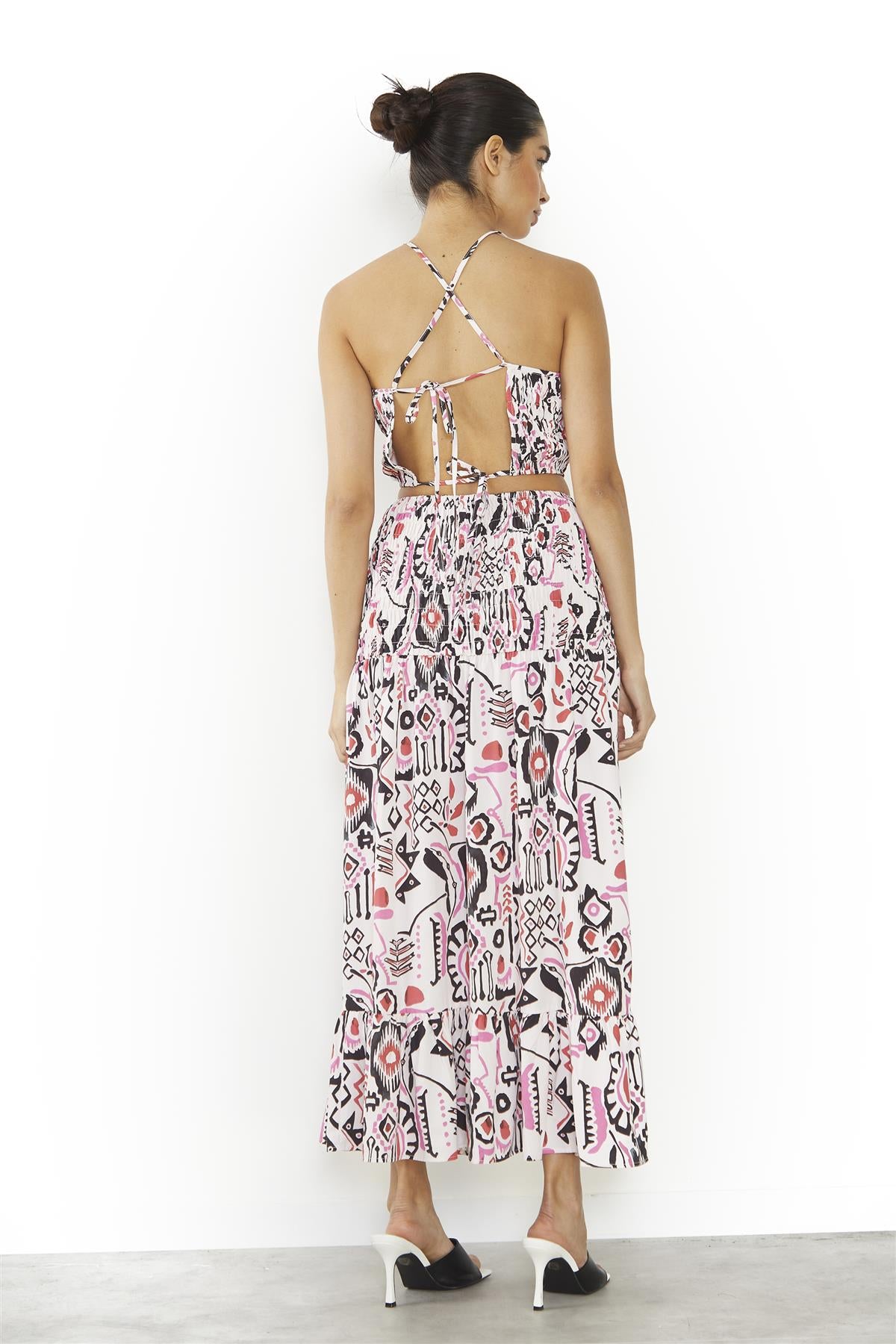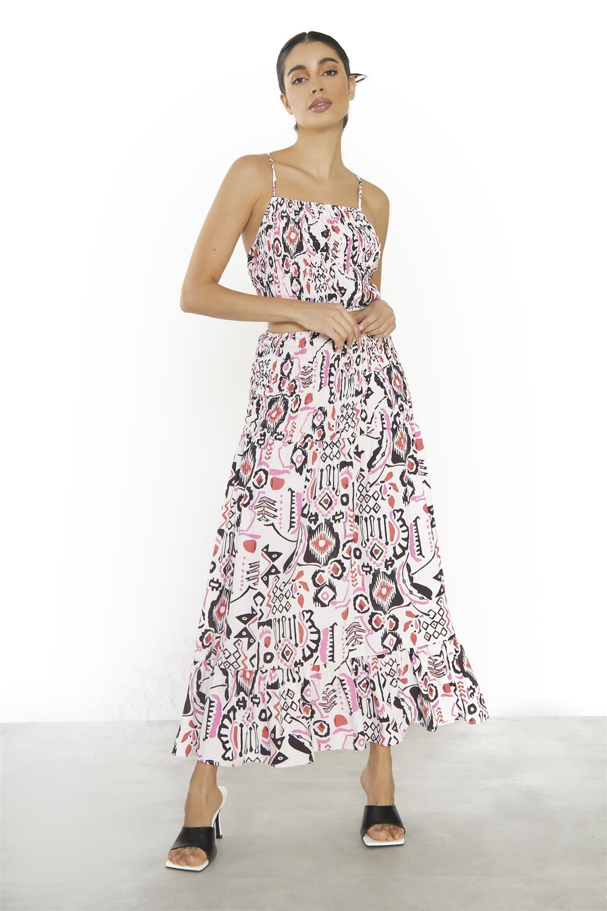 Glamorous Women's Pink Multi Abstract Spaghetti Strap Crop-Top. This pink multi abstract spaghetti strap crop-top is a fun and flirty piece that'll brighten up your wardrobe. The playful abstract pattern in shades of pink catches the eye and adds a pop of colour to any outfit. Its spaghetti straps keep you cool on warm days, while the cropped length shows off just the right amount of skin. The shirred fabric adds texture and ensures a snug, comfortable fit that moves with you. At the back, a cute tie detail lets you adjust the fit to your liking. For a coordinated look, pair it with the matching skirt – it's a combo that's sure to turn heads at any summer gathering. Or mix it up by teaming this top with your favourite jeans or shorts for a more casual vibe. The versatile design makes it easy to dress up or down, perfect for everything from beach days to night outs. This crop-top is all about expressing your fun-loving personality and embracing those sunny vibes.