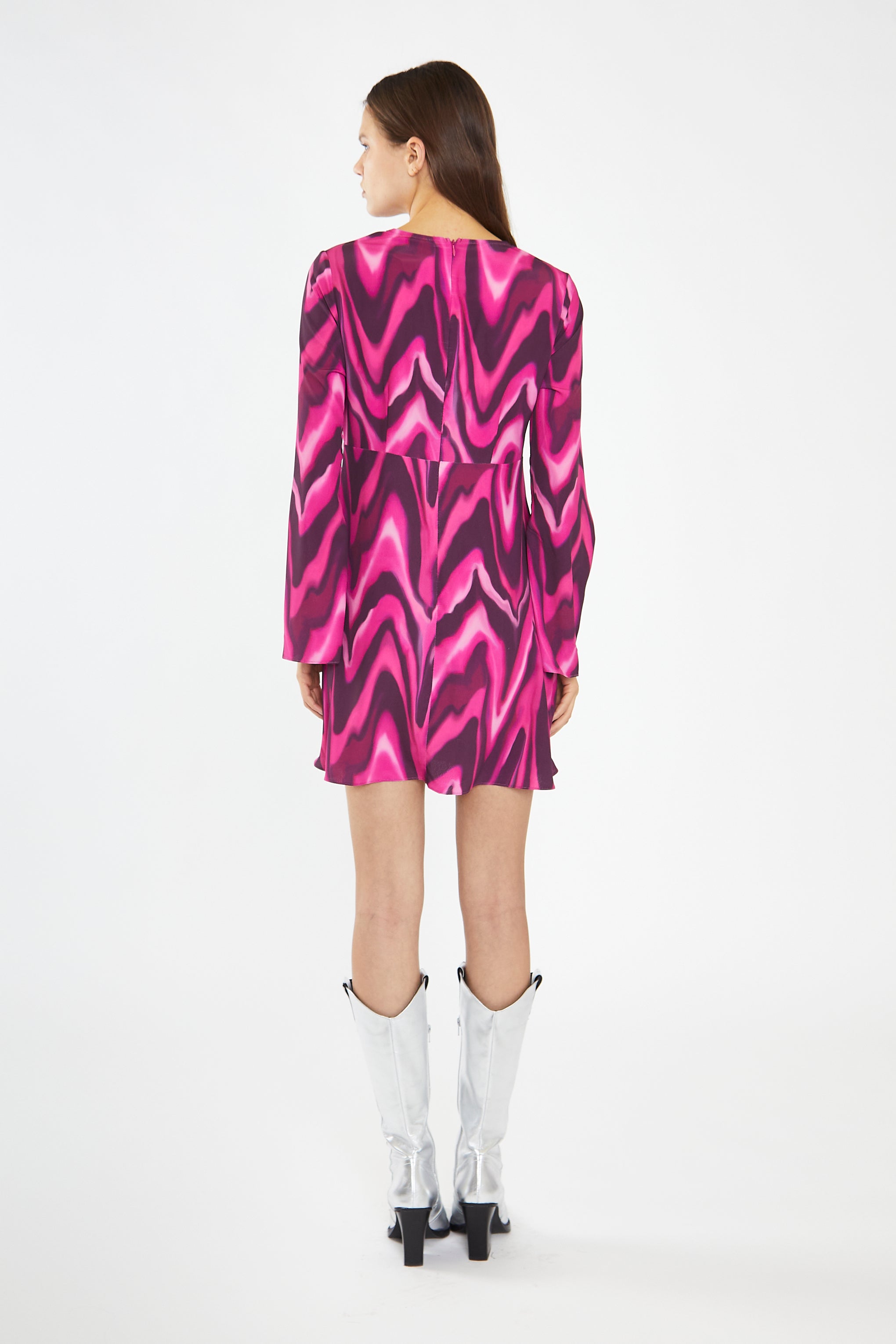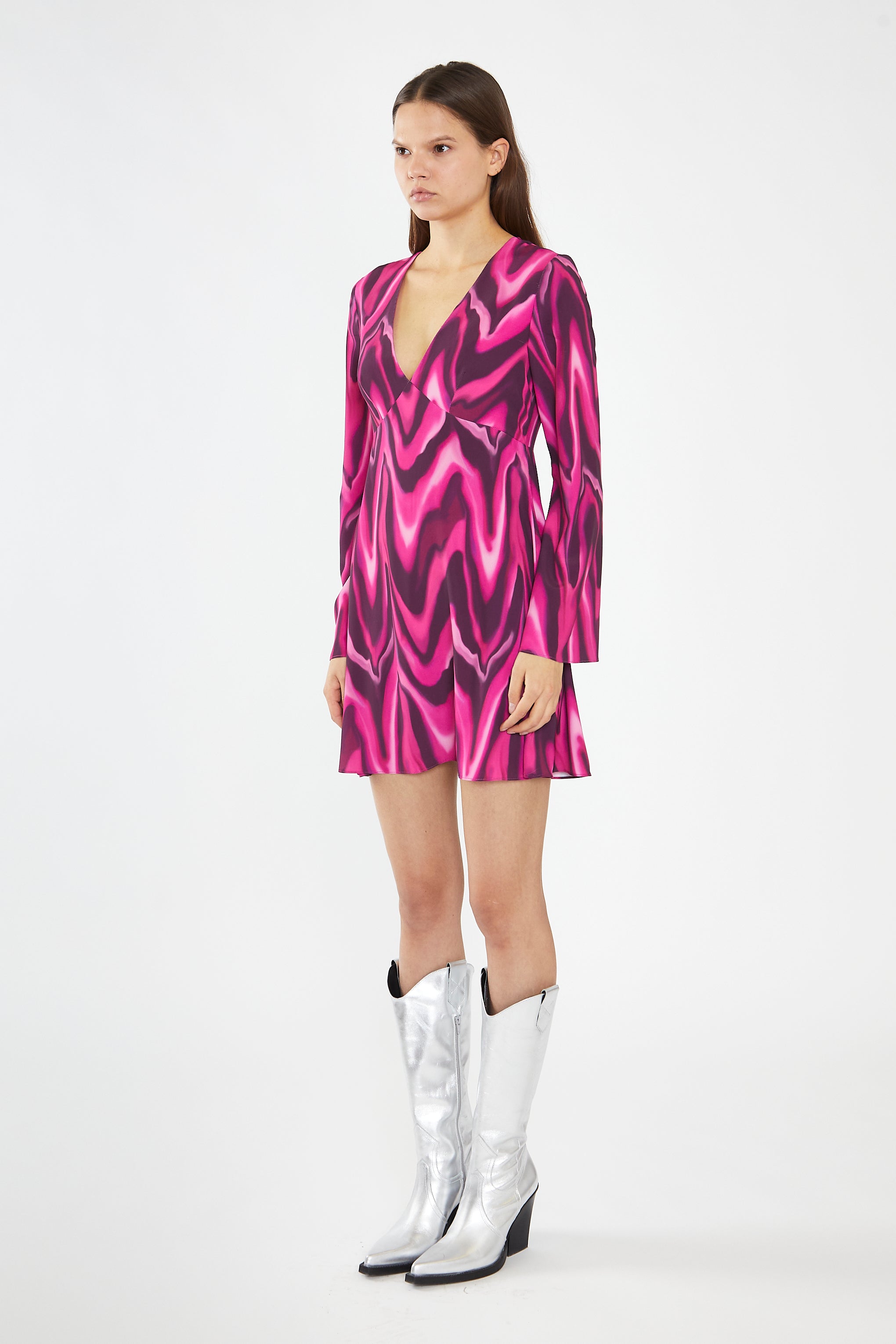 Glamorous Womens Pink Multi-Blurred Wave Flared Sleeve Mini-Dress. Introducing our stunning Pink Multi-Blurred Wave Flared Sleeve Mini-Dress! This eye-catching dress features a flattering V-neck, flowy flared sleeves, and a fitted waist for a feminine silhouette. Perfect for any occasion, the mini length adds a touch of playfulness to this already gorgeous dress.