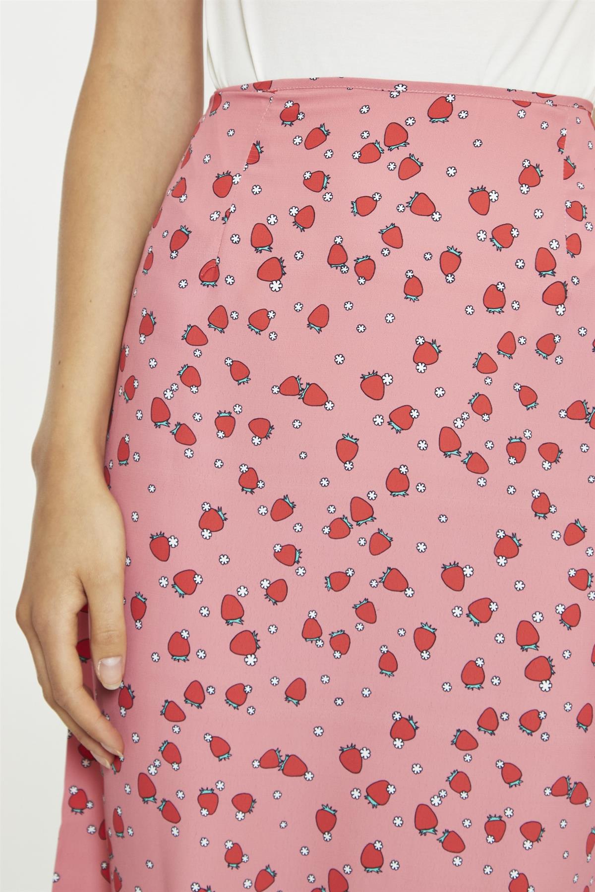 Glamorous Women's Pink Strawberry Print Midaxi-Skirt. Bring a burst of fruity fun to your wardrobe with this playful Midaxi skirt, adorned with an irresistible strawberry print. The A-line cut creates a flattering silhouette that gently flares from the waist, offering both comfort and style. Falling between midi and maxi lengths, this skirt hits that sweet spot of modern elegance and practical wearability. A concealed zip fastening at the side ensures a smooth, fuss-free look while making it easy to put on and take off. This versatile piece is perfect for sunny days in the park, casual office wear, or weekend brunches with friends. Pair it with a crisp white blouse for a polished look, or go casual with a simple tank top and sandals. The charming fruit motif adds a dash of whimsy to any outfit, making this skirt a conversation starter wherever you go. It's a delightful addition to your summer wardrobe that promises to bring a smile to your face every time you wear it.