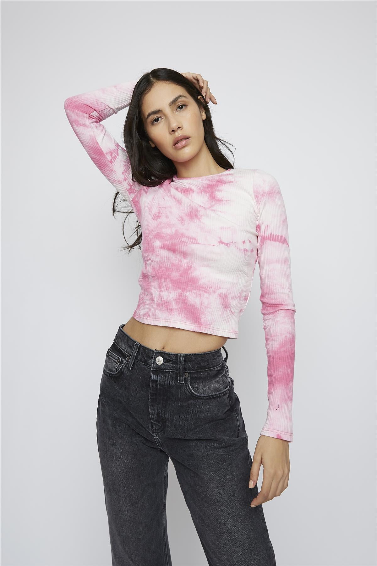 Glamorous Women's Pink-Tie-Dye Long-Sleeve-Ribbed Crop-Top. This long-sleeve ribbed crop top combines casual comfort with a touch of fun through its tie-dye design. The figure-hugging fit follows your natural shape without feeling tight, making it easy to move around in all day. A round neckline keeps the look simple and clean, while the crop length adds a youthful edge that pairs well with high-waisted jeans or skirts. The ribbed texture brings subtle detail and a cozy feel, perfect for layering under jackets or wearing on its own when the weather warms up. It’s a versatile piece that balances style and ease, ready to fit into a relaxed yet thoughtful wardrobe.