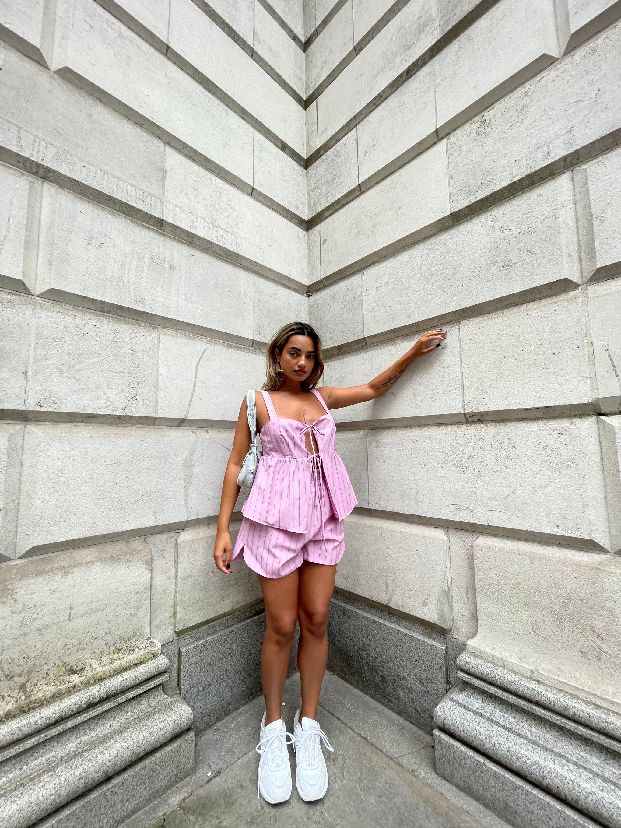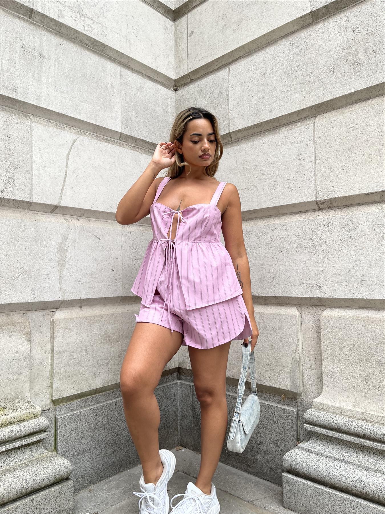 Glamorous Women's Pink Vertical-Stripe Tie-Front Smock-Top. Get ready to turn heads in this playful Pink Vertical-Stripe Tie-Front Smock-Top! The tie-front detail and gathered smock silhouette give it a flirty, fun feel, while the thick straps and full lining provide comfort and support. Perfect for adding a splash of colour to any outfit.