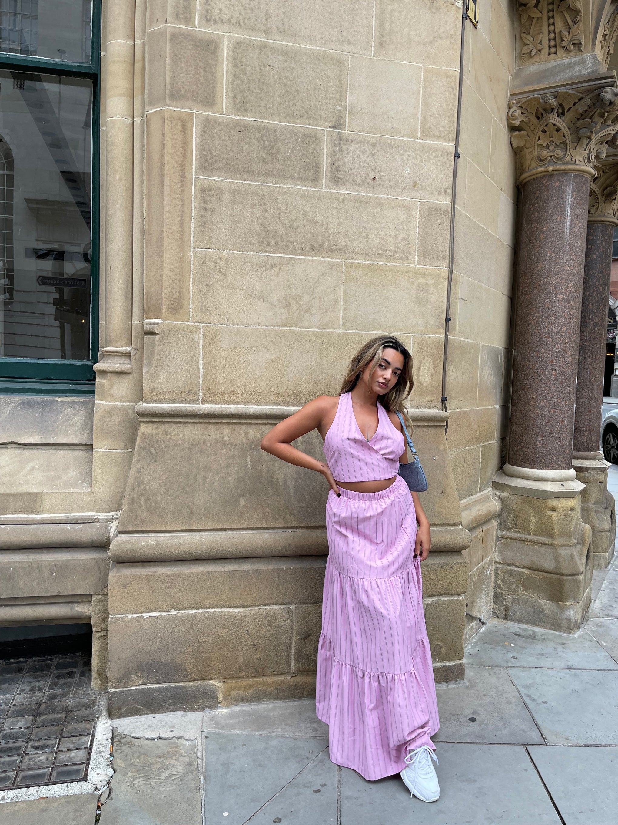 Glamorous Women's Pink Vertical-Stripe Wrap Halterneck Crop-Top. Elevate your look with our Pink Vertical-Stripe Crop-Top. The halter neck and wrap design offer a flattering fit while the cropped length is perfect for pairing with the matching skirt. Together this create that perfect on trend street style look!