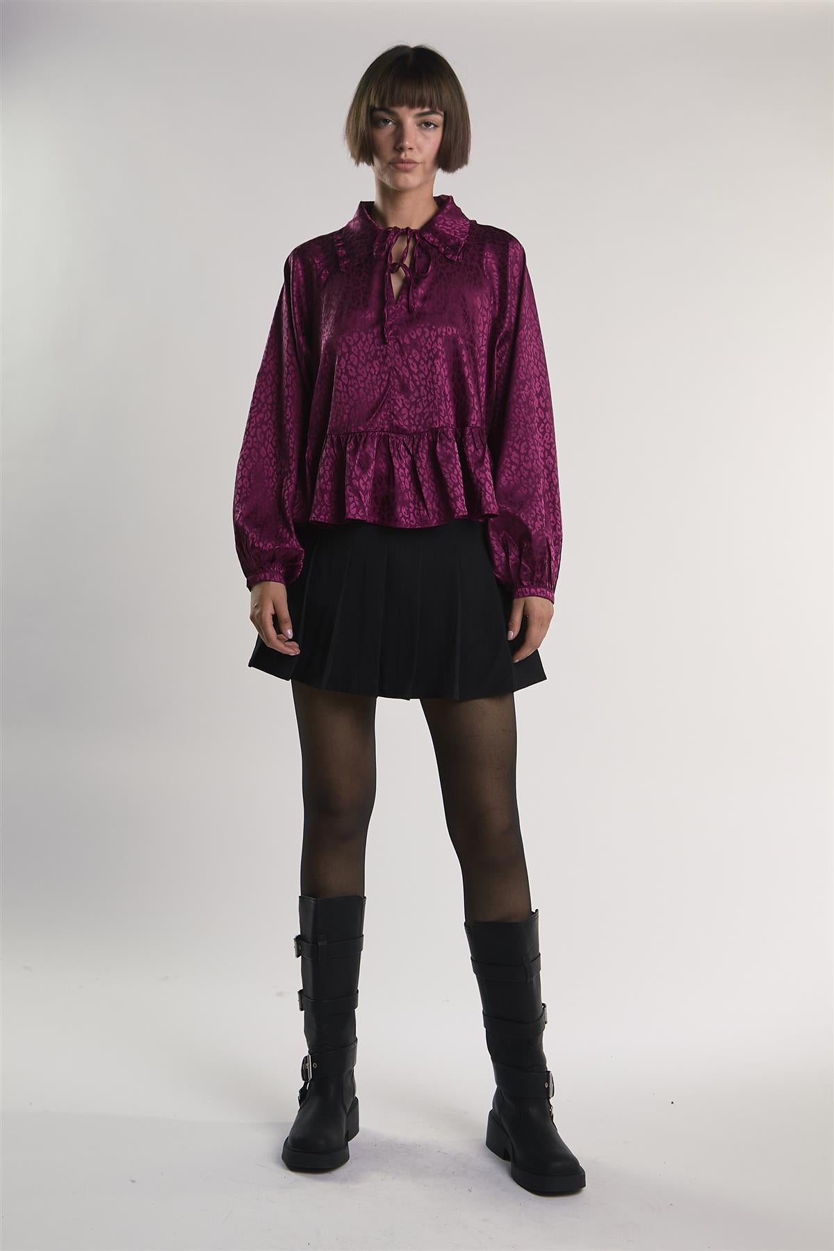 Plum-Leopard-Jacquard Long Puff Sleeve-Top