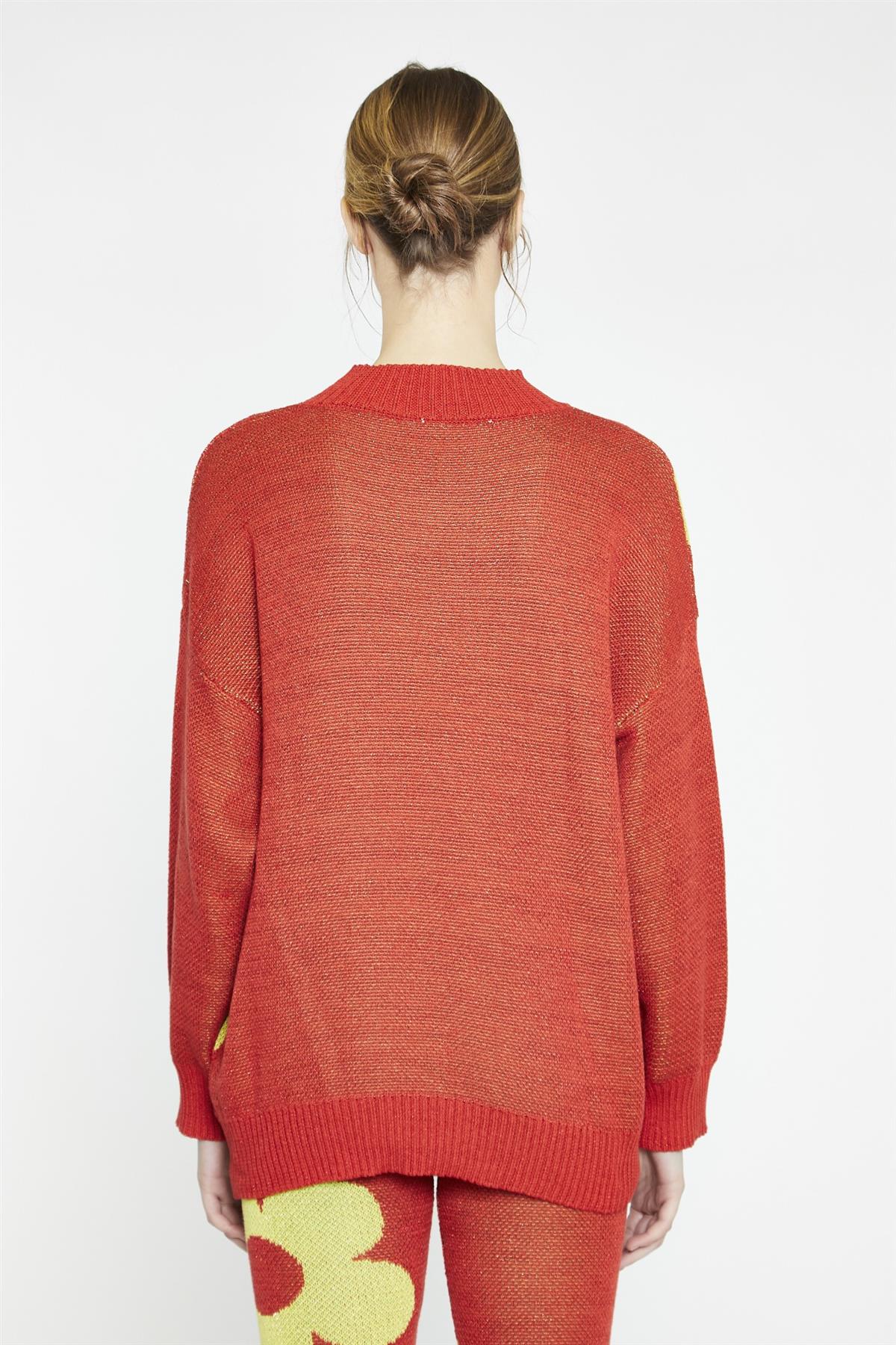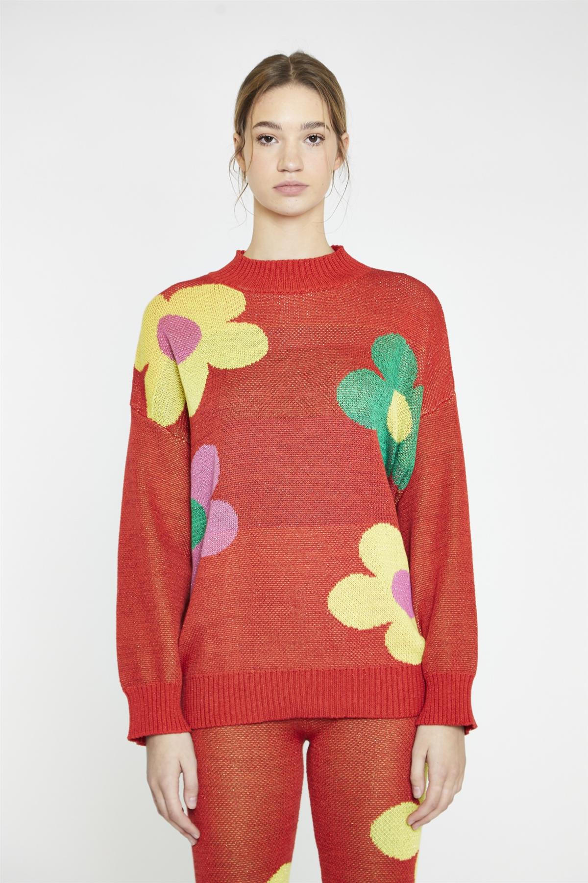Red Multi Glitter Floral Oversized-Jumper