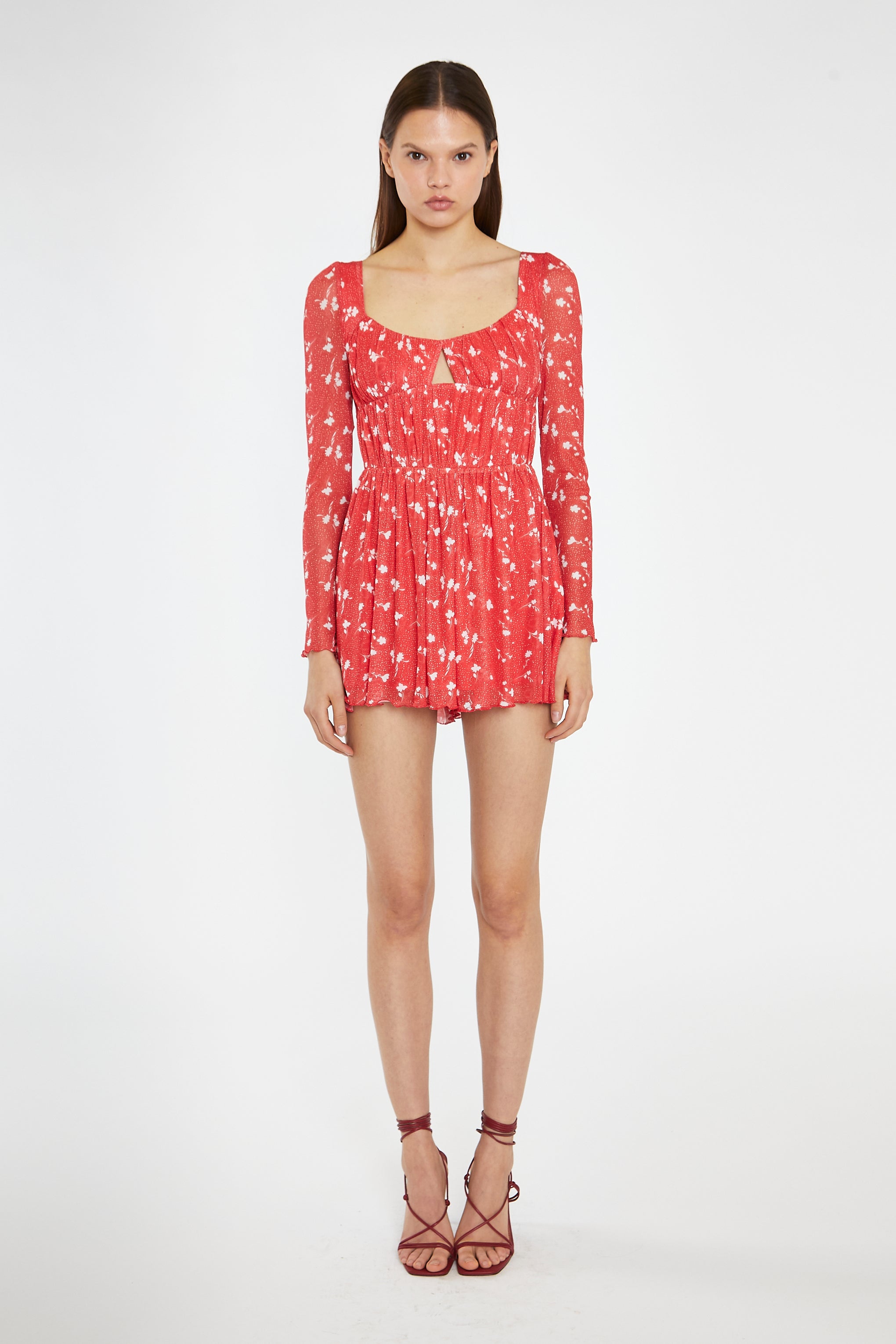 Glamorous Women's Red Vintage-Floral Ruched Long-Sleeve Playsuit. Take risks and make a statement with this bold and beautiful playsuit. The vintage-floral design, ruched bodice with keyhole cut-out detail, and gathered shorts create a daring yet elegant look. With long sleeves and a shirred back panel, this playsuit is both stylish and comfortable.