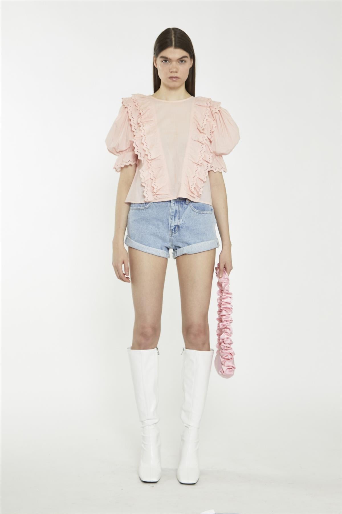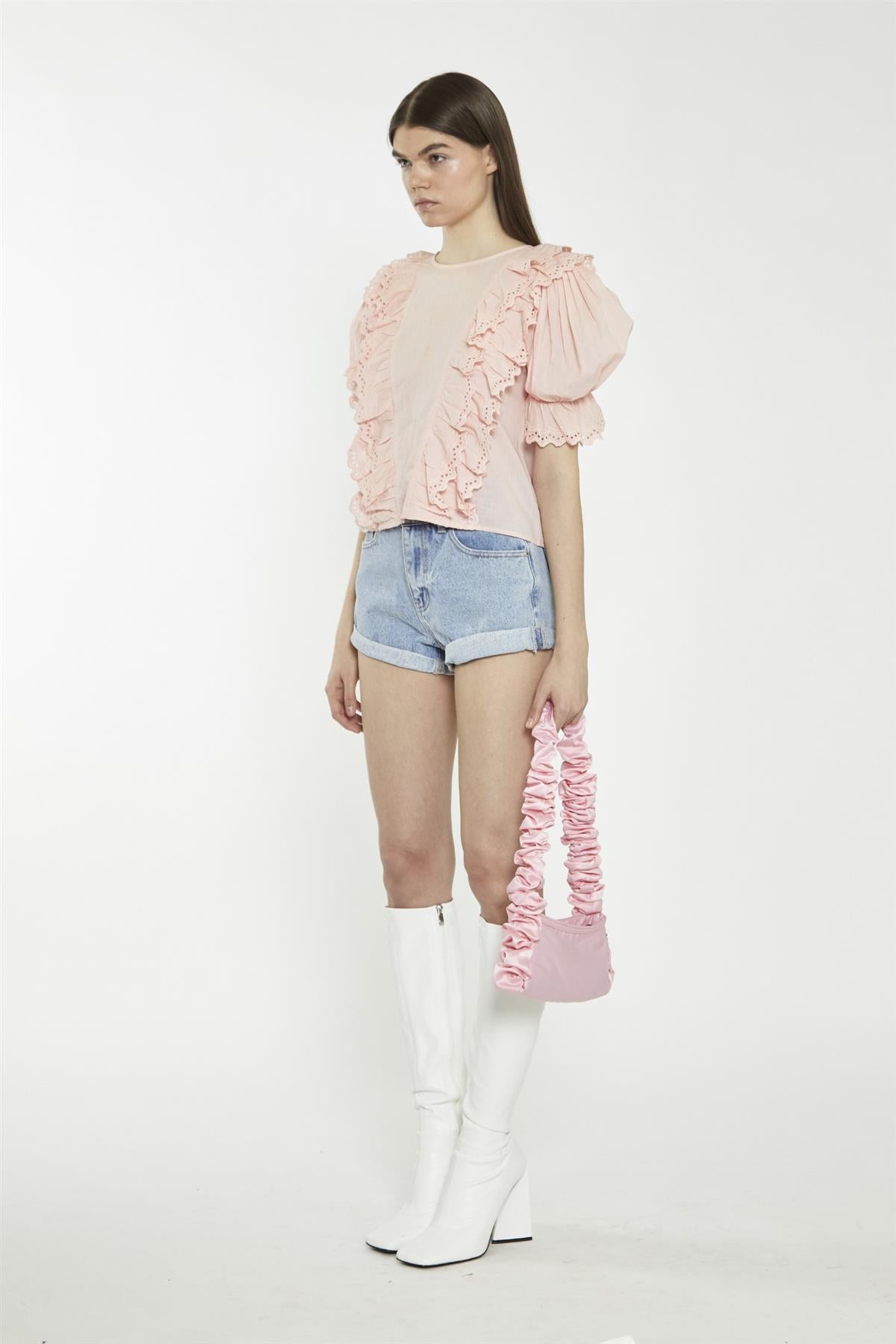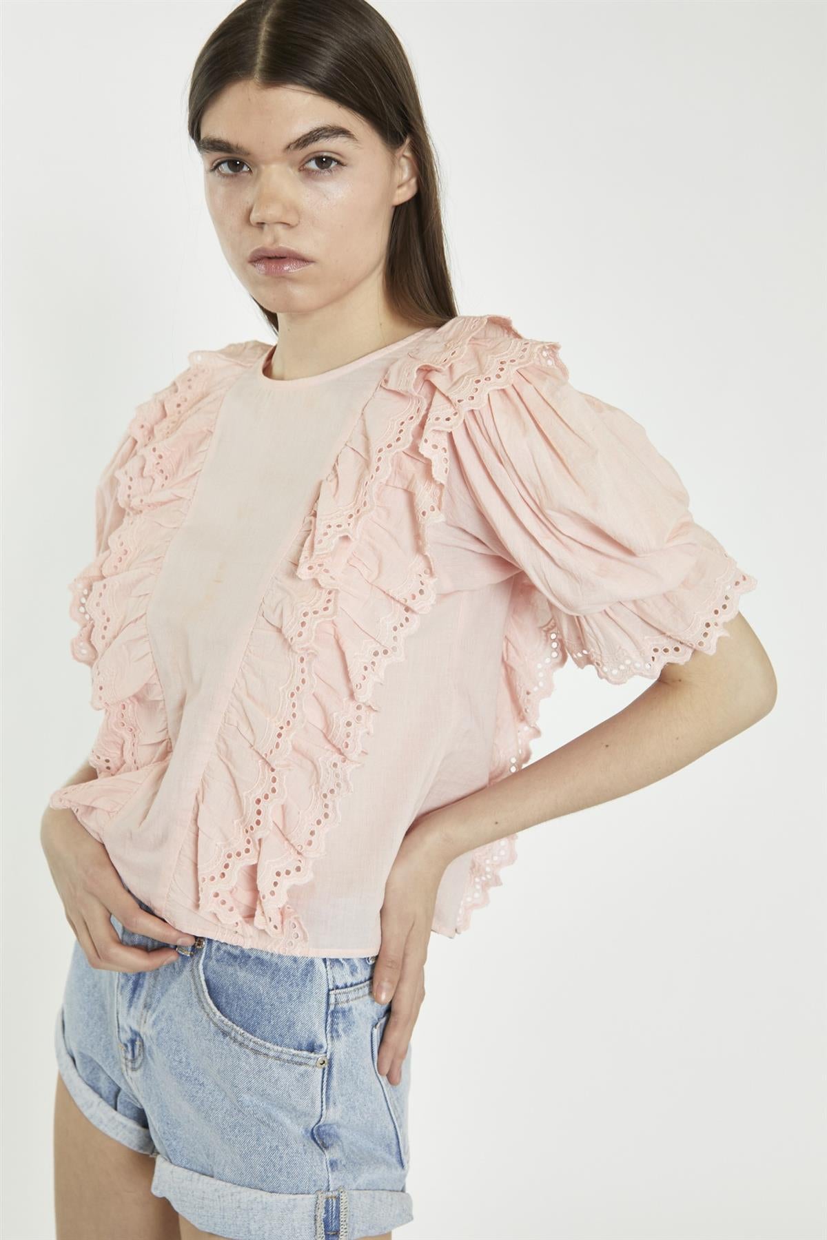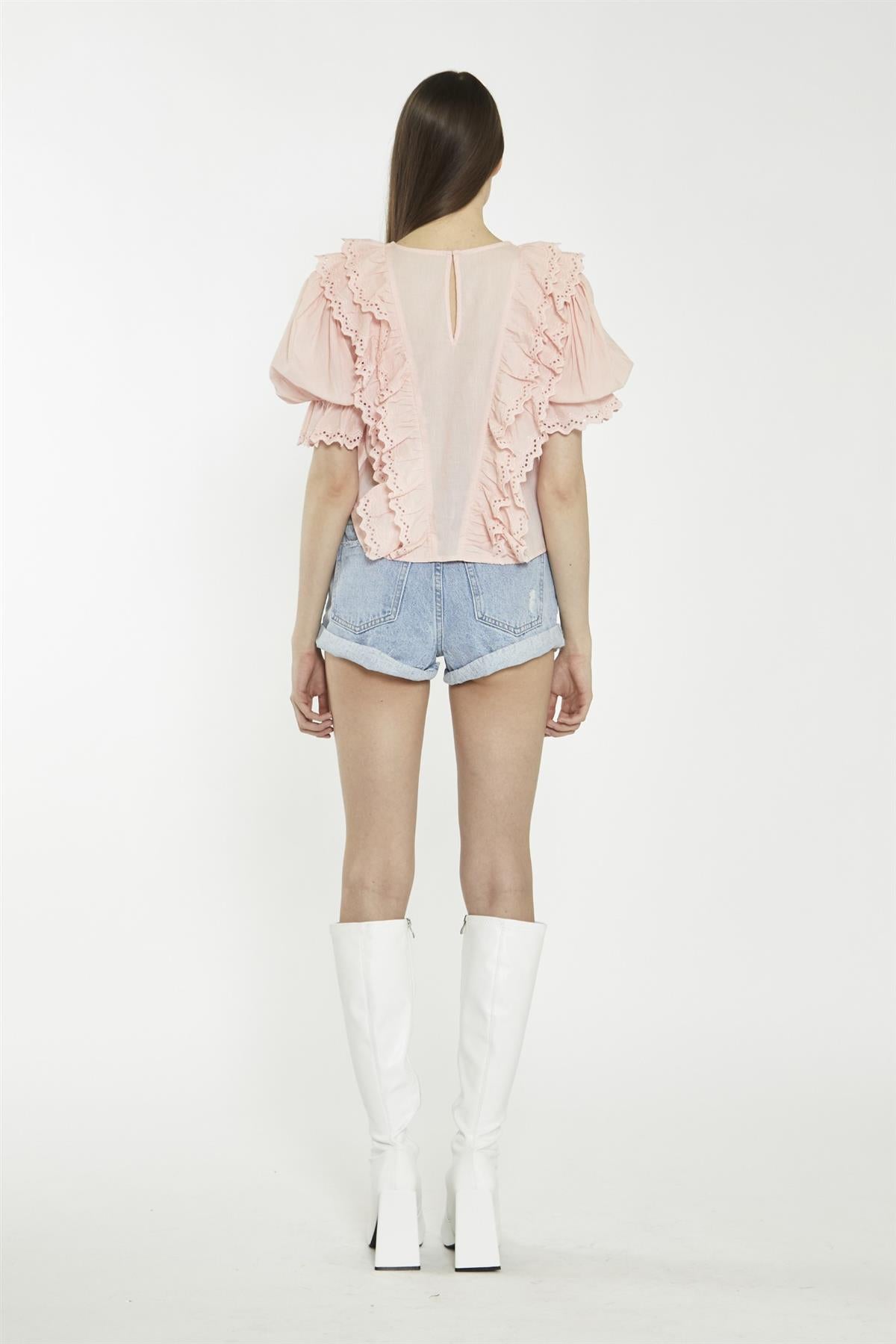 Glamorous Women's Salmon-Pink Ruffle-Layered Top. This salmon-pink ruffle-layered top brings a soft, playful touch to your everyday style, with its delicate multi-ruffle layers that float gently and add a light, breezy feel. The puffed sleeves with ruffle hems give just the right amount of volume, making the top feel special without being too dressed up. The round neckline keeps the look simple and easy to wear, making it a great pick for both casual afternoons or relaxed evening plans. Pair it with simple jeans or a fitted skirt to balance the flowy shape, or match it with delicate jewelry for an easy, pulled-together look. It’s a piece that moves with you, keeping things light and fun all day.