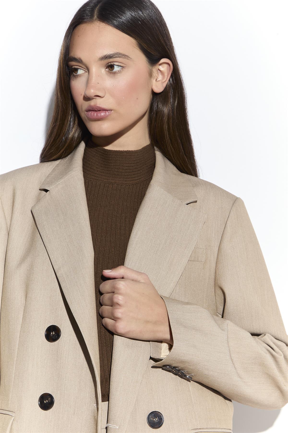 Narrated Women's Sand Double Breasted Blazer. Command attention with ease in this sand double-breasted blazer, designed to bring structure and modern sophistication to your wardrobe. The double-breasted button closure creates a sharp, tailored look while the full lining ensures comfort and a polished finish that holds its shape all day. With a contemporary feel, this blazer balances classic tailoring with current style, making it versatile for both workwear and smart-casual outfits. Pair it with slim trousers or a sleek skirt to complete a refined ensemble that feels confident, effortless, and thoughtfully put together.