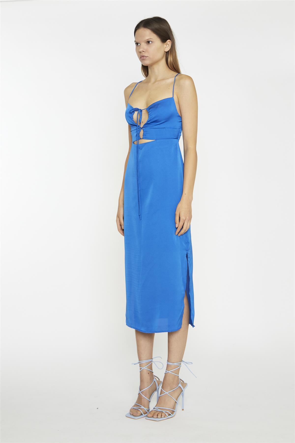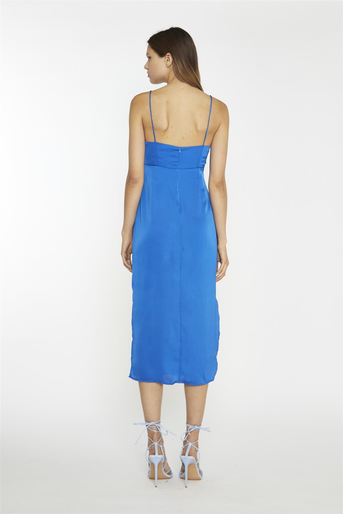 Glamorous Women's Scoop Neck Slip Midi Dress - Blue Sateen. Find a sense of effortless flow as you slip into this scoop neck midi dress, designed to give you a smooth, easy silhouette through its low cut neckline and delicate spaghetti straps that keep the look light and relaxed. The tie front adds a soft touch of shape where you want it, while the side split brings comfortable movement that feels naturally flattering. A concealed zip fastening at the back keeps the finish clean and simple, helping the dress sit smoothly from every angle. Style with your favourite minimal accessories or laid-back layers for a look that feels calm, confident, and beautifully understated.