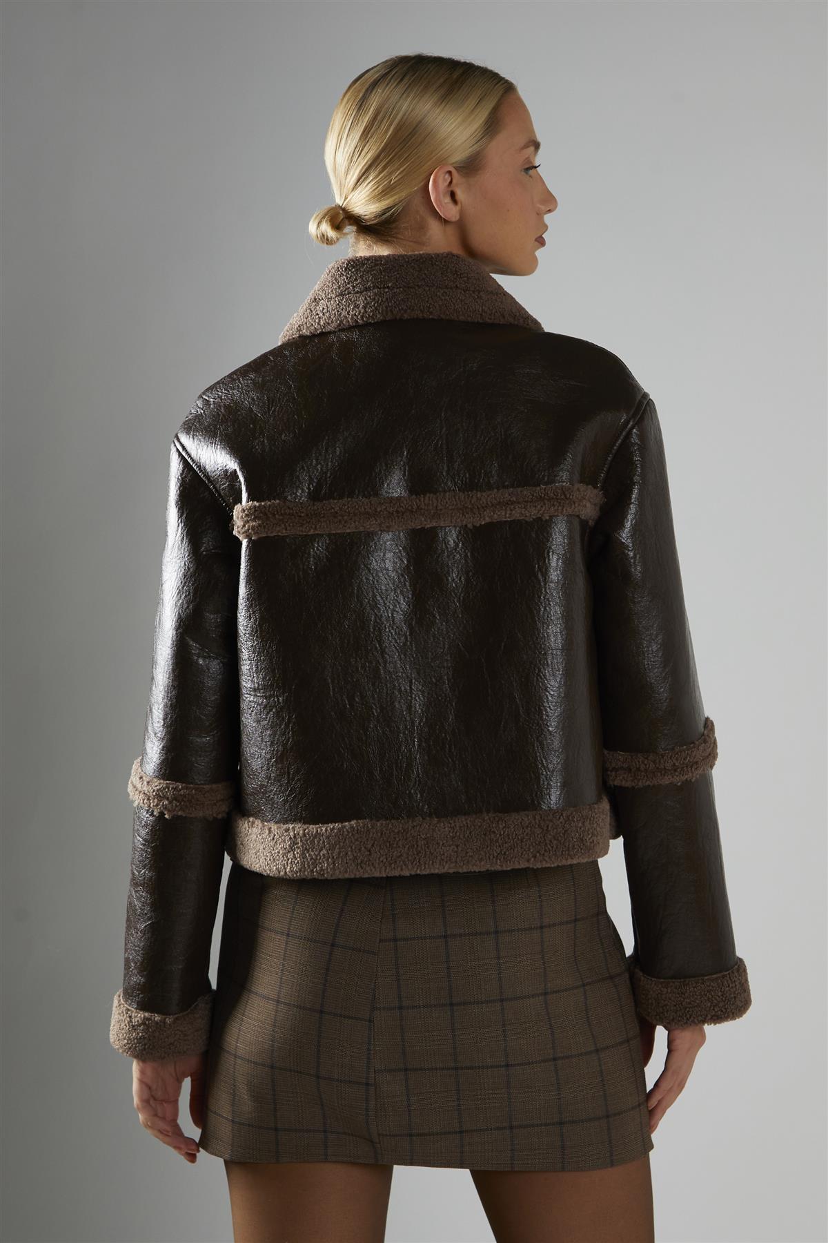 Glamorous Women's Shearling Crop Coat - Dark Brown. Bring style and comfort together with this shearling crop coat, designed to add texture and warmth to your look without losing its modern edge. The spread collar and borg trims give it a soft, plush feel that’s easy to wear while keeping the silhouette structured and flattering. A zip fastening adds practicality and a clean finish, making it simple to layer over any outfit. With its long sleeves and cropped cut, it balances relaxed comfort with a contemporary shape. Style with denim or high-waisted trousers for an effortlessly put-together finish.