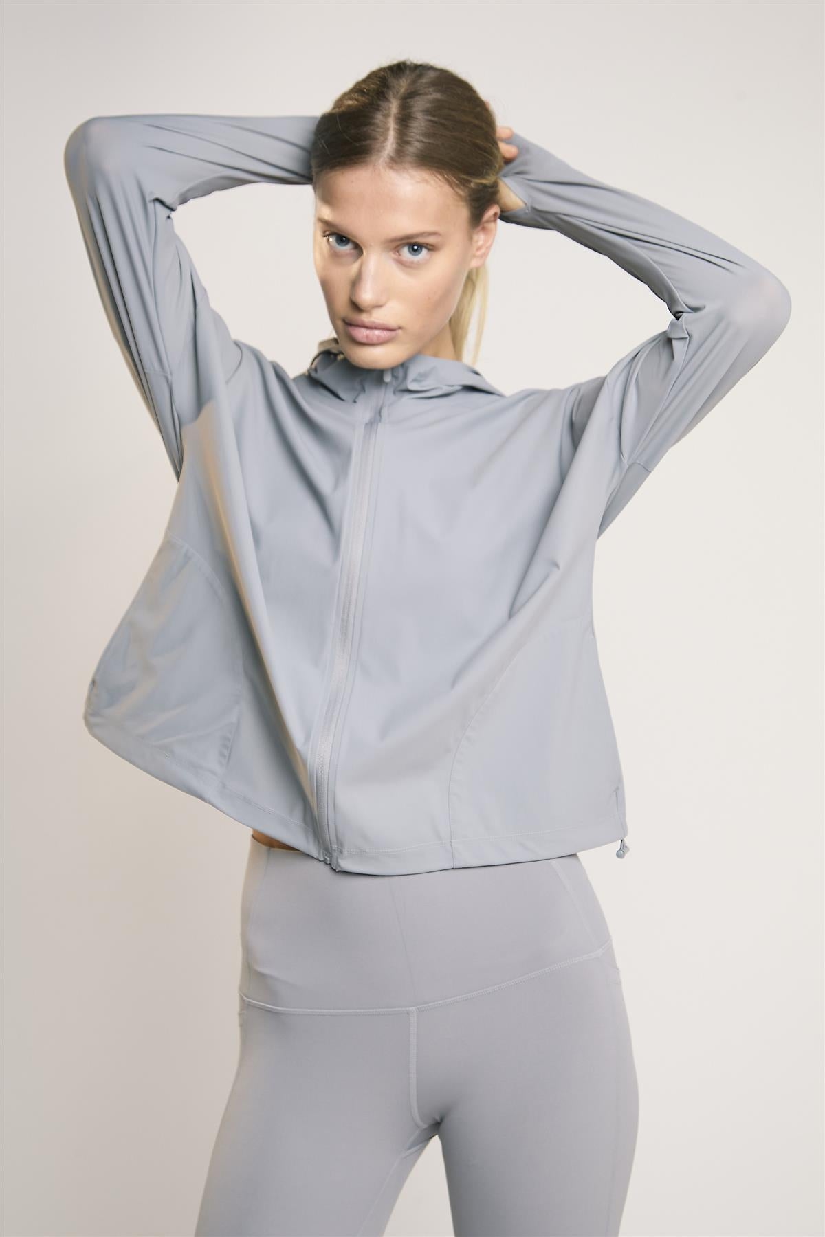 Agon Women's Signature Light Grey Wind-Breaker Jacket. Experience comfort and style with our signature wind-breaker jacket from the Agon Signature Range. This versatile piece is designed to be your go-to for unpredictable weather, keeping you protected and looking great. The full-zip feature allows for easy on and off, while the long sleeves provide ample coverage against the elements. Practical pockets offer convenient storage for your essentials, making this jacket perfect for outdoor activities or casual outings. The hood adds an extra layer of protection when you need it, easily adjustable to suit your needs. Crafted with smooth-finish fabric, this jacket feels great against your skin and moves with you effortlessly. Body-sculpting seam details create a flattering silhouette that enhances your natural shape. From morning jogs to evening walks, this wind-breaker adapts to your active lifestyle, offering both functionality and fashion. It's the perfect blend of practicality and style, ready to support you through all your daily adventures.