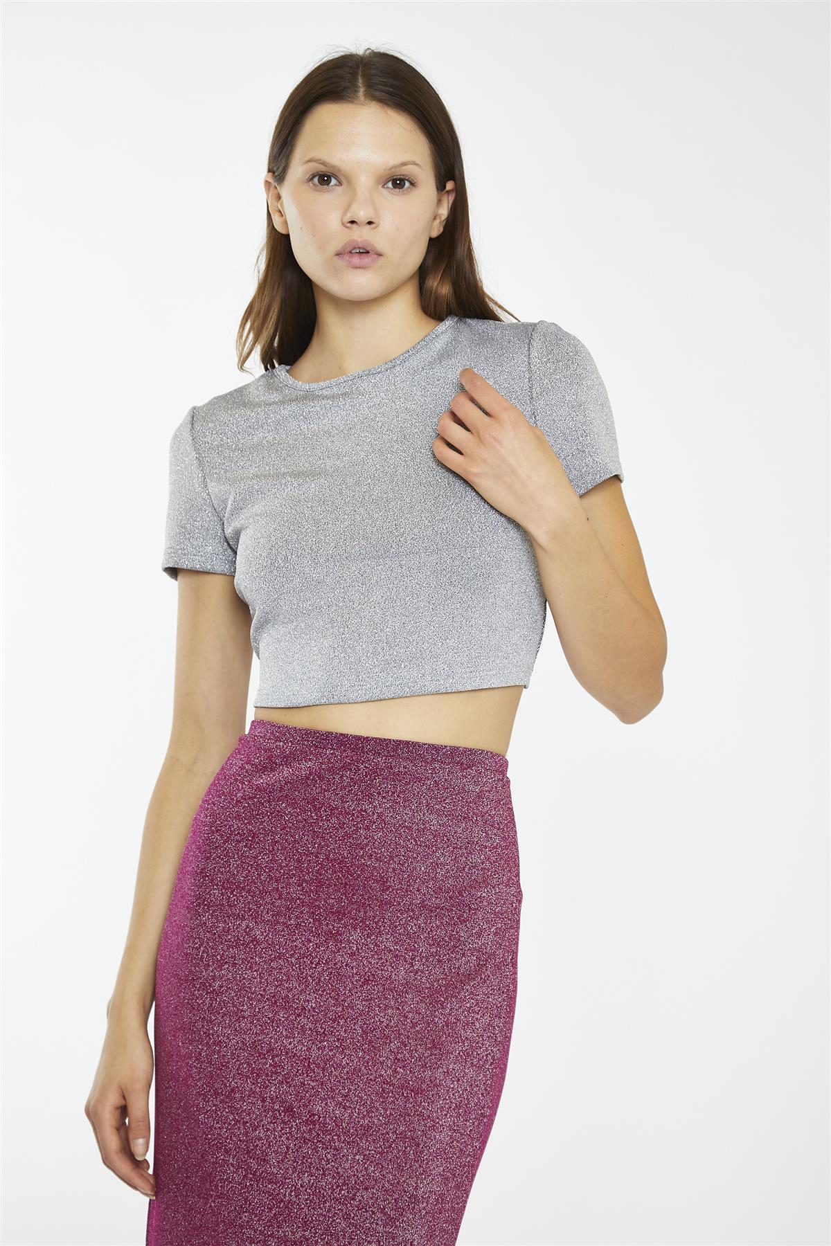 Glamorous Women's Silver-Glitter Open-Back Crop-top. Sparkle and shine in this dazzling silver-glitter open-back crop top. The short sleeves offer a comfortable fit while allowing you to show off a bit of skin, making it ideal for warm evenings or dance-filled nights. A round neckline keeps the front classic and versatile, while the open back adds an unexpected twist that's sure to turn heads. The tie-back feature lets you adjust the fit to your liking, ensuring both comfort and style. This top isn't just clothing; it's a mood-booster that brings instant glamour to any outfit. Pair it with high-waisted jeans for a casual-chic look, or team it with a sleek skirt for more formal occasions. The glittery fabric catches the light with every move, making you feel like a walking disco ball in the best way possible. It's the perfect choice for parties, nights out, or any time you want to add a touch of sparkle to your day. Let this crop top be your go-to piece for bringing fun and excitement to your wardrobe.