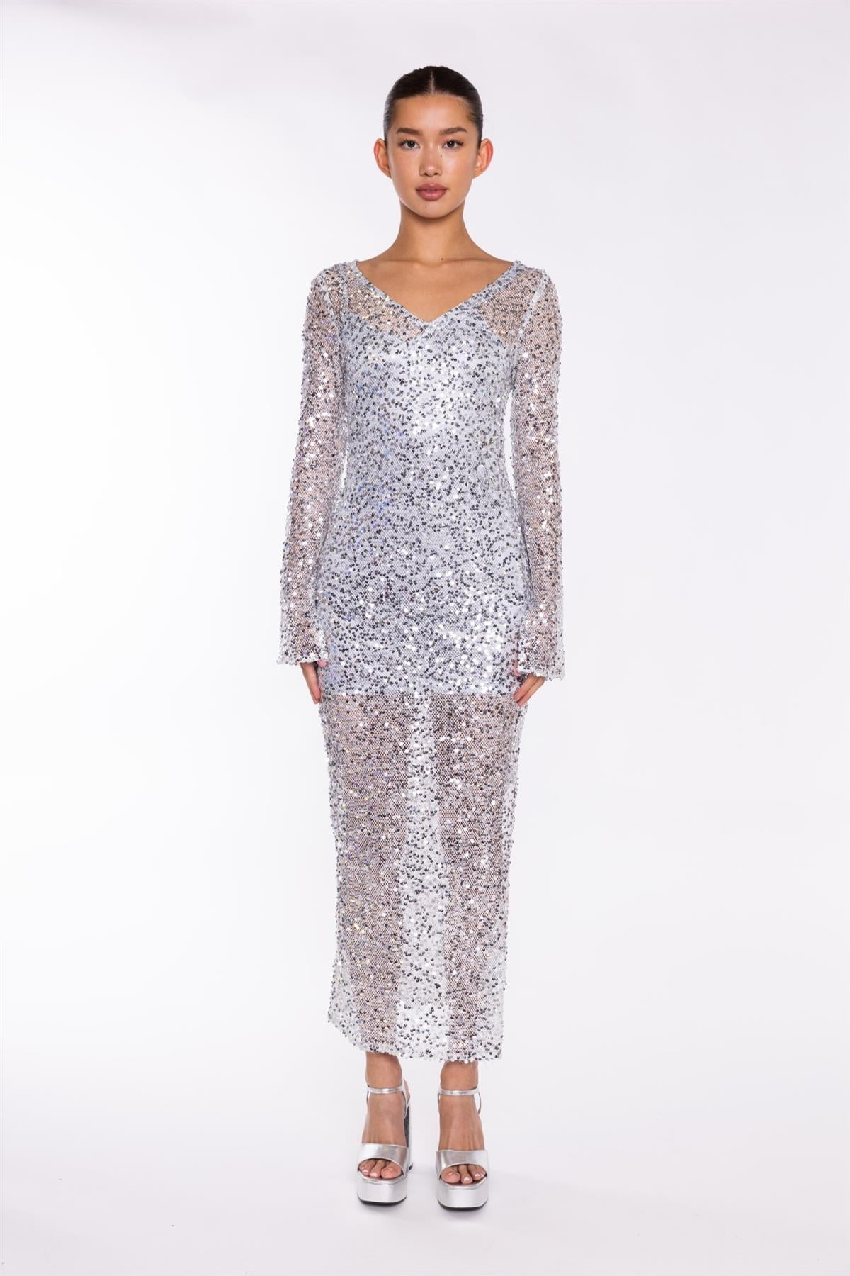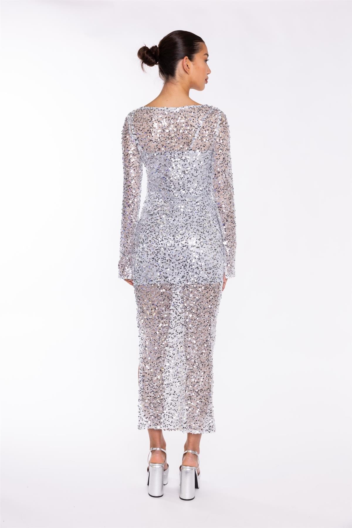 Glamorous Women's Silver Sequin-Mesh V-neck Maxi-Dress. Elevate your style with our captivating Silver Sequin-Mesh V-neck Maxi-Dress. This stunning piece features a flattering V-neckline that draws the eye upwards, while the long, flared sleeves add a touch of elegance. The shimmering sequin fabric catches the light, creating a mesmerizing effect that's sure to turn heads. With side splits for ease of movement and a maxi length for a graceful silhouette, this dress is perfect for any special occasion. The included slip dress lining ensures a smooth, comfortable fit, making it a versatile choice for any event. Embrace your inner sparkle and let this captivating dress elevate your style.