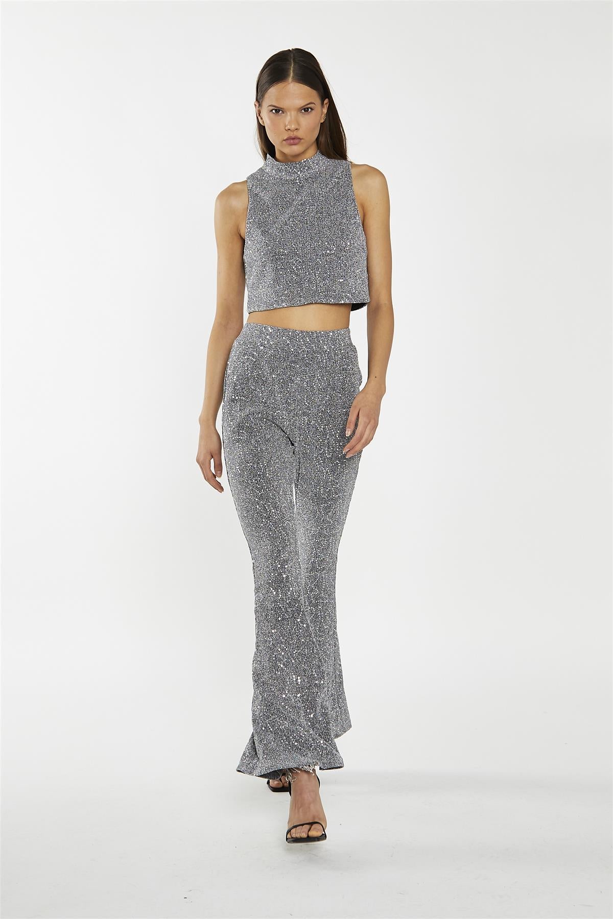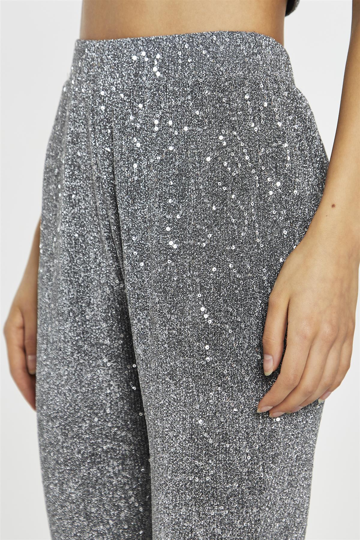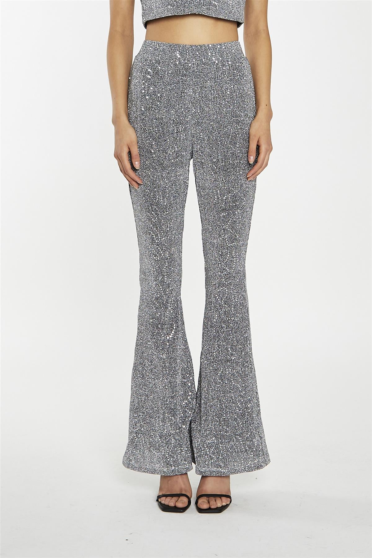 Glamorous Women's Silver-Sequin Plisse Flared-Trousers. Shine bright in these silver sequin plisse flared trousers. The sequin fabric catches the light with every step, creating a mesmerizing effect that's sure to turn heads. The flared silhouette is both flattering and on-trend, elongating your legs and creating a sleek, streamlined look. The elasticated waistband ensures all-day comfort, so you can dance the night away without a care. Pair these trousers with the matching sequin top for a coordinated look that's guaranteed to slay. Or, mix and match with your favourite tops and shoes to create a look that's all your own. These sequin trousers are the perfect pick-me-up for your wardrobe, guaranteed to put a smile on your face and make you feel confident and fabulous..