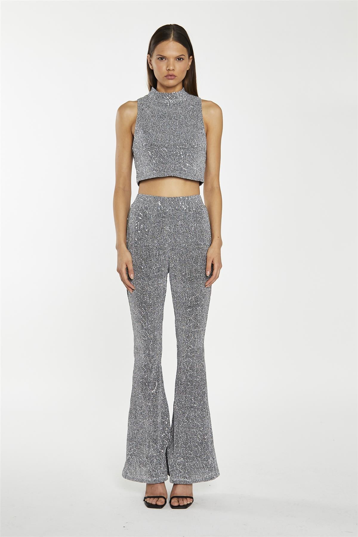 Silver-Sequin Plisse High-Neck Crop-Top
